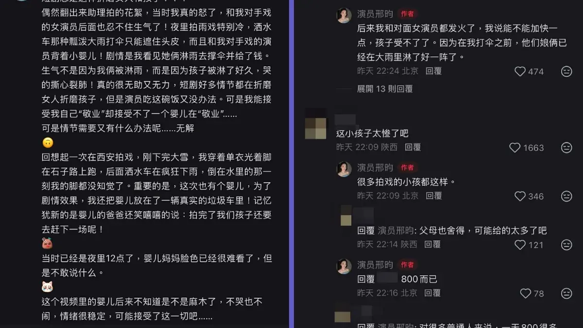 นักแสดงสาว ซิงอวิ๋น (邢昀) ได้ออกมาแฉความจริงอันน่าหดหู่ผ่านสื่อโซเชียล โดยระบุถึงเหตุการณ์ขณะถ่ายทำละครสั้นในคืนที่อากาศหนาวเหน็บ กองถ่ายได้ใช้รถน้ำฉีดเพื่อสร้างฉากฝนตกหนัก ทำให้นักแสดงที่แบกทารกไว้บนหลังและตัวเด็กเองต้องเปียกปอนไปทั้งตัว ทารกส่งเสียงร้องไห้อย่างหนักด้วยความทรมานจากความเย็น แต่เมื่อมีการทักท้วงให้ใช้ตุ๊กตาแทนเด็กจริง ทีมงานกลับปฏิเสธโดยอ้างว่า "เพื่อประหยัดเวลา"