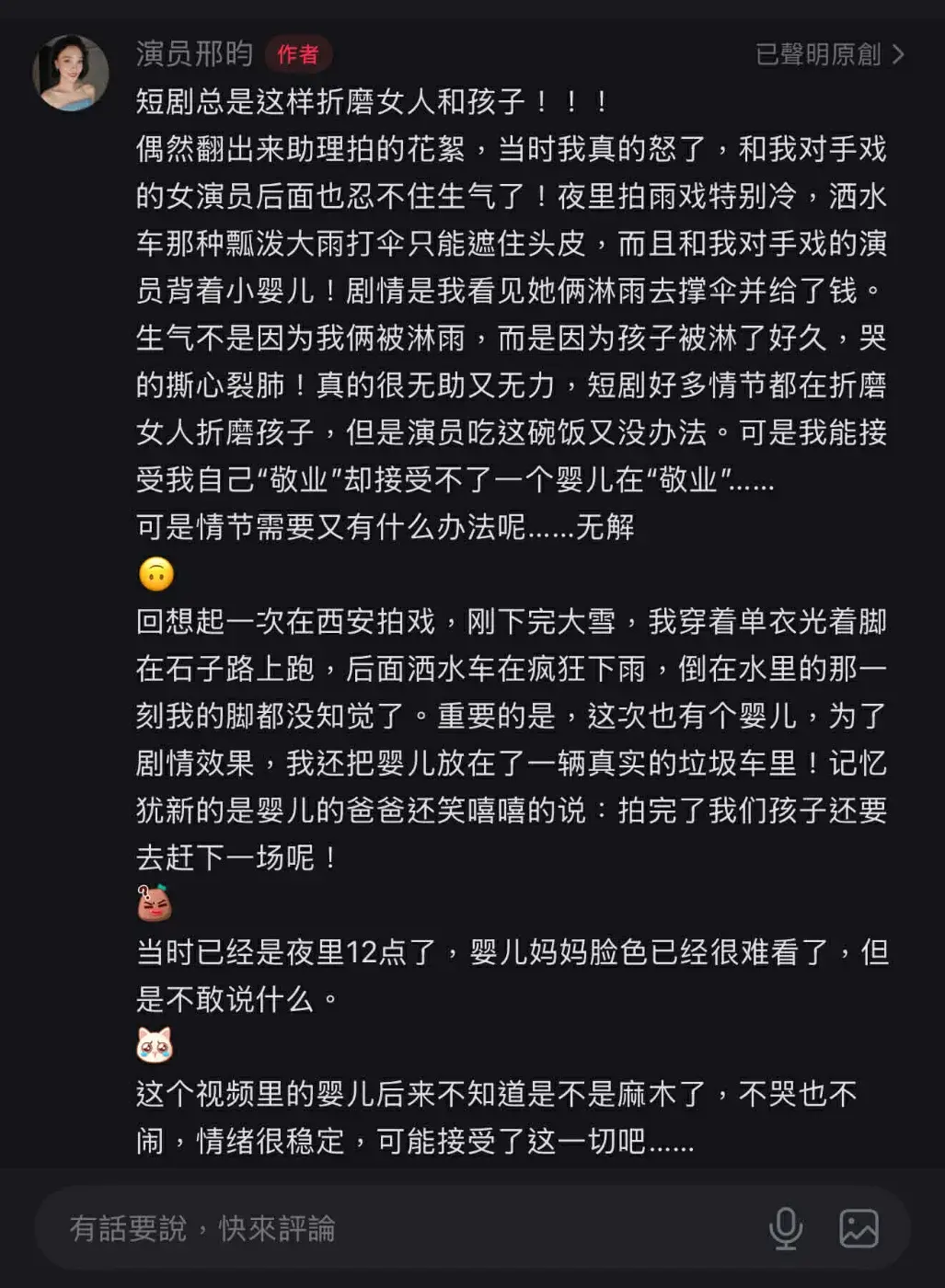 "สิง อวิ๋น" ระบุว่า "ฉันรู้สึกโกรธและเจ็บปวดใจเป็นอย่างมาก เพราะเห็นเด็กถูกฝนสาดอยู่นานจน เด็กร้องไห้อย่างสุดกำลัง ทั้งน่าสงสารและไร้ทางช่วยเหลือ ละครสั้นหลายเรื่องเต็มไปด้วยเนื้อหาที่ทรมานผู้หญิงและเด็ก นักแสดงก็จำเป็นต้องทำงานเพื่อปากท้อง แต่ฉันยอมรับได้กับความทุ่มเทของตัวเอง แต่ทว่าฉันไม่อาจยอมรับ ที่ให้ทารกต้องมาทุ่มเทเช่นนี้ได้เลย..."