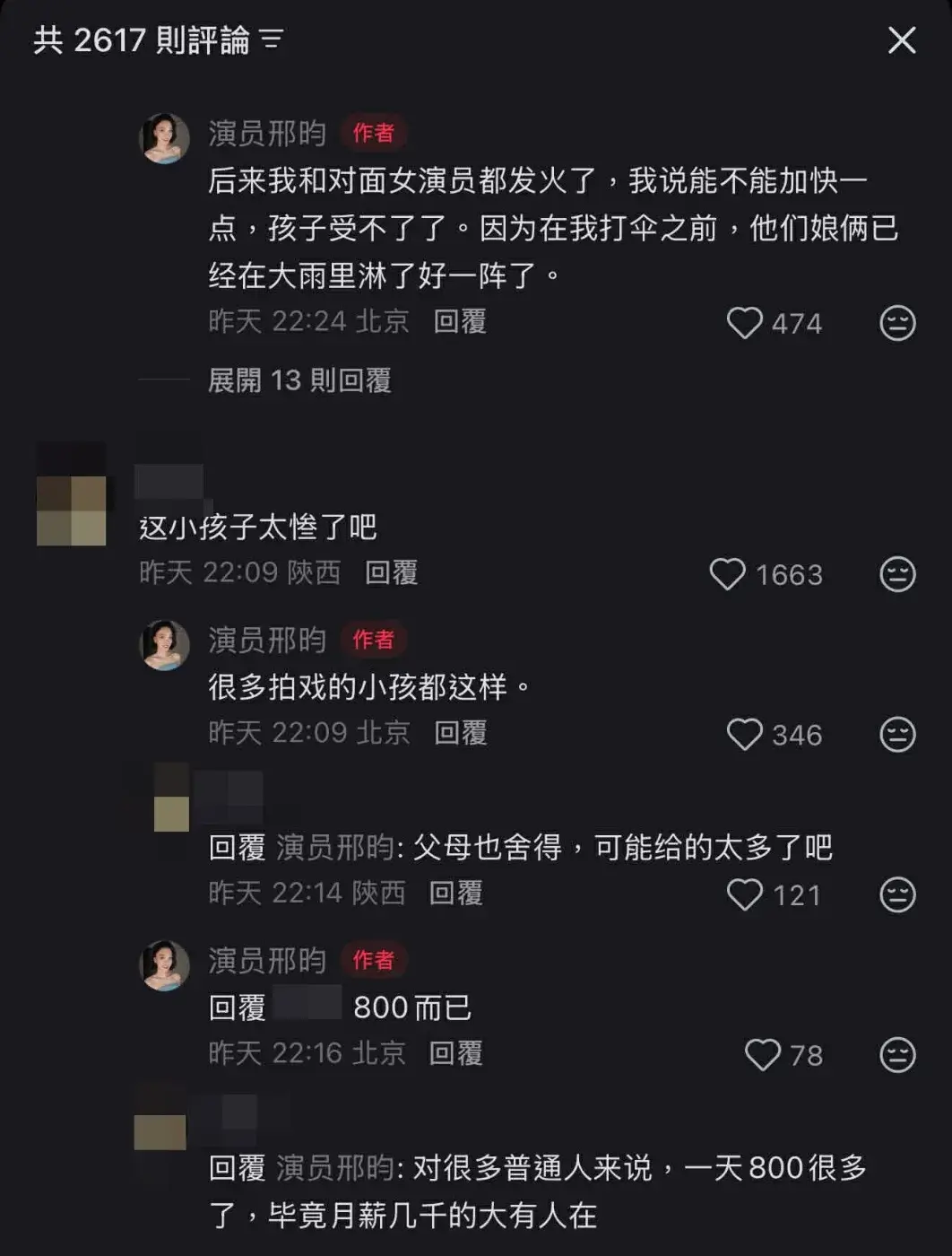 "สิง อวิ๋น" ยังระบุอีกว่า "เด็กนักแสดงหลายคน ต้องเผชิญกับสภาพเช่นนี้เป็นเรื่องปกติ เพื่อเงินแค่ 800 หยวนเอง" และ "ขณะนั้นเป็นเวลาหลังเที่ยงคืน แม่ของเด็กมีสีหน้าไม่พอใจอย่างชัดเจน แต่ไม่กล้าพูดอะไรเพราะเธอรับเงินมาแล้ว"