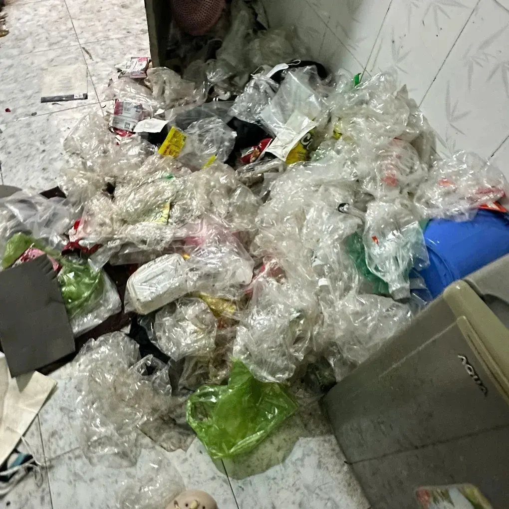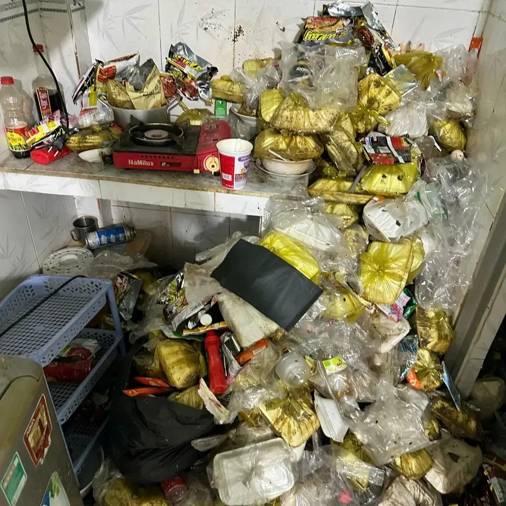 ภายในห้องมีขยะกองสูงราวกับภูเขา การเคลื่อนไหวภายในเป็นไปอย่างยากลำบาก ขยะส่วนใหญ่เป็นกล่องโฟมใส่อาหาร กระป๋องน้ำอัดลม ถุงพลาสติก และ ก้นบุหรี่ ซึ่งดูเหมือนว่าตลอดหลายปีที่อาศัยอยู่ ผู้เช่าไม่เคยทำความสะอาดห้องเลย แม้จะสวมหน้ากากอนามัยอย่างมิดชิด ผู้ที่เข้าไปเห็นต่างก็รู้สึกคลื่นไส้อย่างรุนแรง