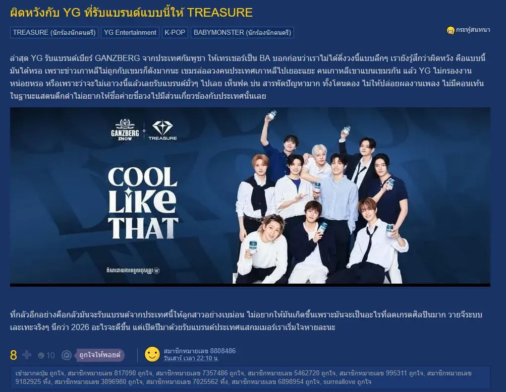 นอกจากนี้ในเว็บดังของไทยอย่าง "พันทิป" ก็มีชาวเน็ตโพสต์กล้าวแสดงความผิดหวังเป็นอย่างมาก โดยโพสต์ว่า "ล่าสุด YG รับแบรนด์เบียร์จากประเทศกัมพูชา ให้วง Treasure เป็นโปรโมท" และ "บอกก่อนว่าเราไม่ได้ติ่งวงนี้แบบลึกๆ เรายังรู้สึกว่าผิดหวัง คือแบบนี้มันได้หรอ? เพราะข่าวเกาหลีไม่ถูกกับเขมรก็ดังมากนะ เขมรล่อลวงคนประเทศเกาหลีไปเยอะแยะ คนเกาหลีเขาแบนเขมรกัน แล้ว YG ไม่กรองงานหน่อยหรอ? หรือ เพราะว่าจะไม่เอาวงนี้แล้วเลยรับแบรนด์มั่วๆไปเลย"
