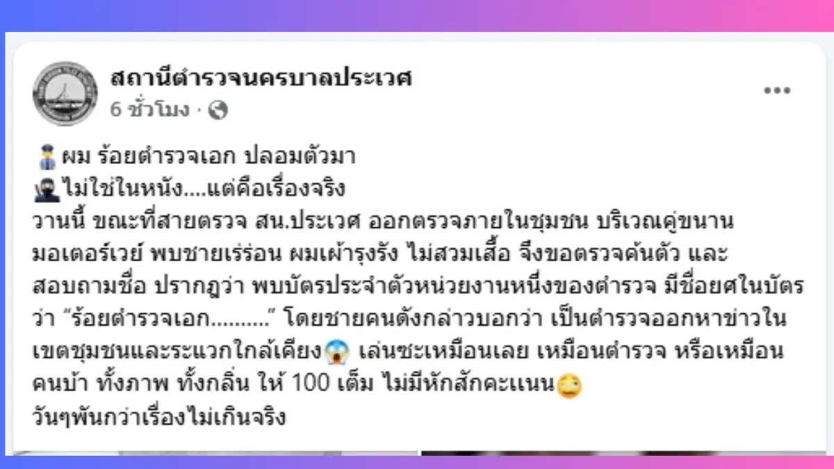 บทสรุป: เหตุการณ์นี้สะท้อนให้เห็นถึงสีสันการทำงานของเจ้าหน้าที่ตำรวจที่บางครั้ง "เรื่องจริงยิ่งกว่านิยาย" แม้จะยังไม่มีการคอนเฟิร์มอย่างเป็นทางการจากหน่วยงานต้นสังกัดของบัตรใบนั้นว่าชายคนนี้คือเจ้าหน้าที่ตัวจริงหรือไม่ แต่ความเนียนระดับสิบเต็มร้อยนี้ก็ได้ใจชาวเน็ตไปเต็มๆ และทำให้รู้ว่าภายใต้ภาพลักษณ์ที่เราเห็นบนท้องถนน อาจมี "ภารกิจลับ" ซ่อนอยู่มากกว่าที่คิด