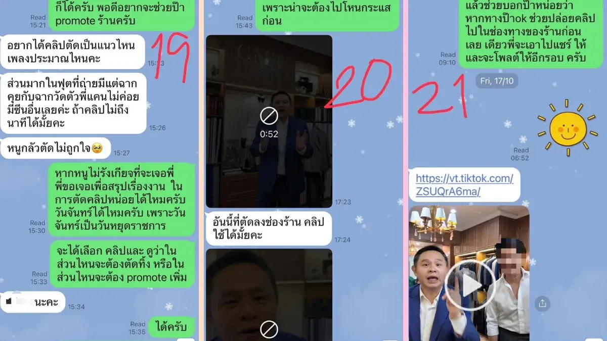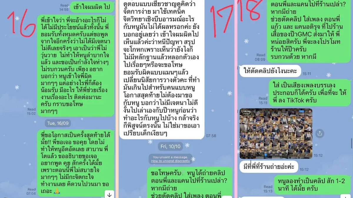 3. การเผชิญหน้าและข้อเสนอทางธุรกิจ หลังจากเหตุการณ์ดังกล่าว ทนายพยายามขอพบเพื่อทำความเข้าใจแต่ถูกปฏิเสธและต่อว่าว่าใช้จิตวิทยาหลอกเด็ก อย่างไรก็ตาม ในช่วงเดือนตุลาคมกลับมีการพูดคุยเรื่องงานโปรโมทร้านผ่านคลิปวิดีโออีกครั้ง ซึ่งบทสนทนาดูเป็นปกติจนกระทั่งมีการแชทขอโทษซ้ำอีกครั้งในภายหลัง