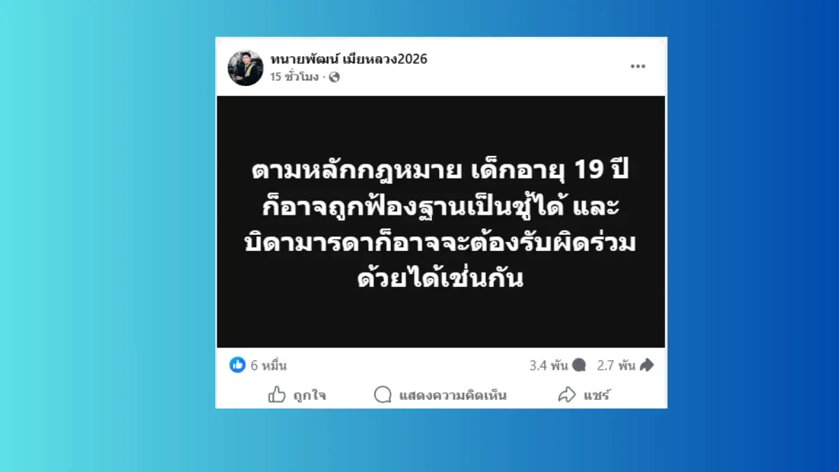 คำเตือนแรงจาก "ทนายพัฒน์" ทนายเมียหลวงแห่งปี 2026 ที่ทำให้สังคมต้องหันกลับมาตระหนักถึงข้อกฎหมายอย่างจริงจัง เมื่อนิยามของคำว่า "ชู้" ไม่ได้จำกัดเพียงผู้ใหญ่ แต่เยาวชนวัย 19 ปี ก็อาจต้องแบกรับความผิดทางแพ่งที่ลามไปถึงกระเป๋าเงินของผู้ปกครองด้วย