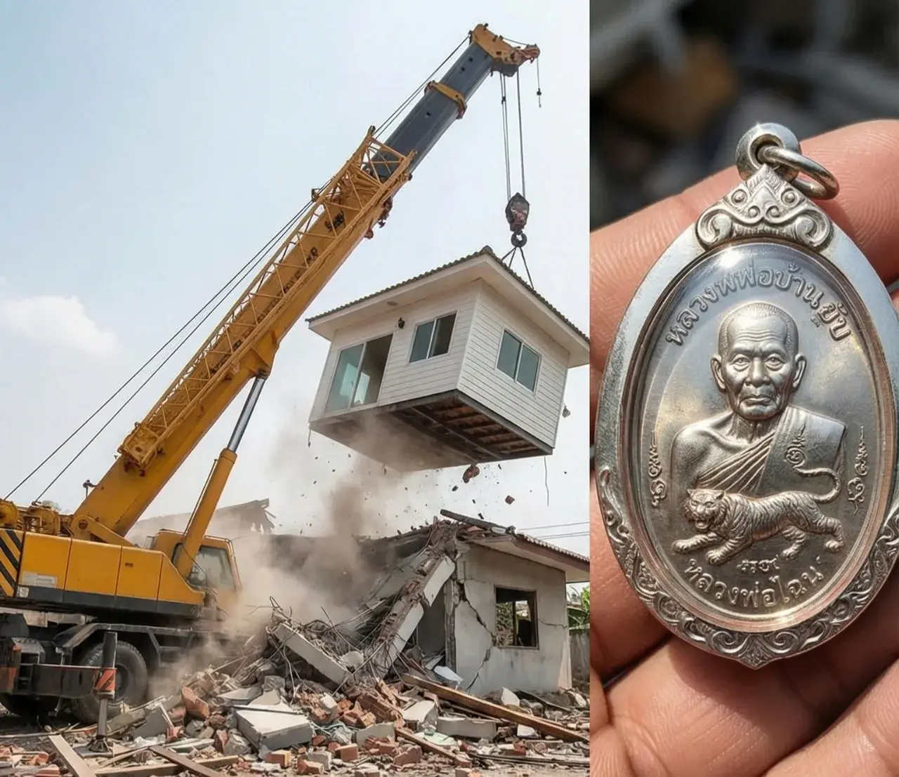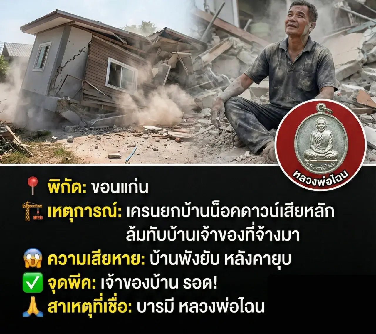 นาทีชีวิต! เครนยกบ้านน็อคดาวน์พลาดล้มทับบ้านพังยับที่ขอนแก่น เจ้าของรอดตายปาฏิหาริย์... เชื่อบารมี "หลวงพ่อไฉน" คุ้มครอง!