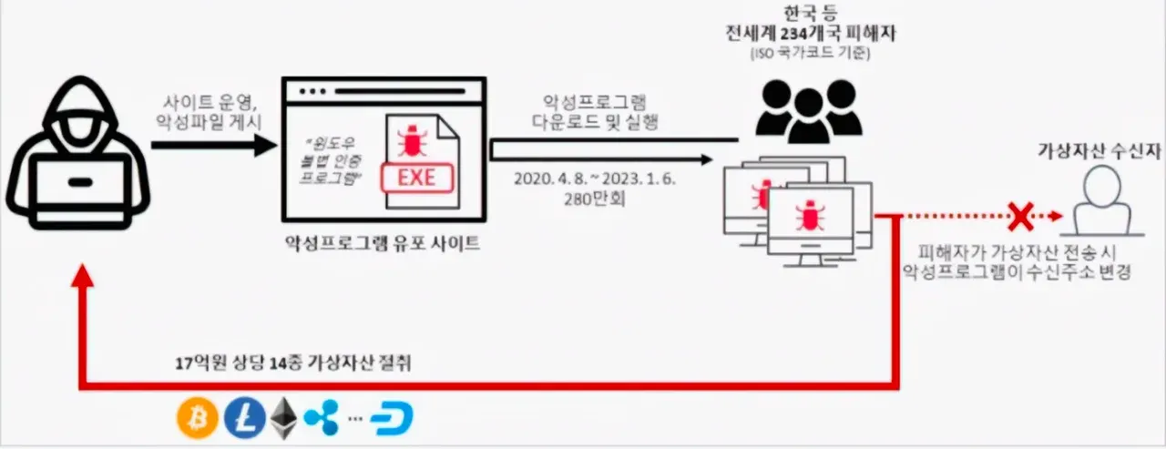 ซึ่งทางกรมตำรวจแห่งประเทศเกาหลีใต้ (Korean National Police Agency) ที่ได้ทำการติดตามสอบสวนมัลแวร์ตัวนี้มานาน ได้เปิดเผยว่าตัวมัลแวร์สร้างความเสียหายไปมากถึง 1,200,000 ดอลลาร์สหรัฐ (37,825,200 บาท) จากธุรกรรมกว่า 8,400 ครั้ง ระหว่างกระเป๋าเงินคริปโตกว่า 3,100 เลขหมาย ซึ่งการสืบสวนของทางกรมตำรวจนั้นได้เริ่มดำเนินการตั้งแต่ปี ค.ศ. 2020 (พ.ศ. 2563) หลังจากได้รับการแจ้งเหตุเกี่ยวกับมัลแวร์ขโมยเหรียญคริปโตเคอร์เรนซี ซึ่งสามารถสืบทราบไปถึงที่อยู่ของผู้ต้องสงสัยในประเทศลิทัวเนีย และด้วยความร่วมมือของตำรวจสากล (Interpol) ก็ได้นำไปสู่การบุกตรวจค้นที่อยู่ของผู้ต้องสงสัย ในเดือนธันวาคม ค.ศ. 2024 (พ.ศ. 2567) และได้หลักฐานเป็นคอมพิวเตอร์โน้ตบุ๊คและโทรศัพท์มือถือจำนวนมาก มาเพื่อทำการตรวจสอบ