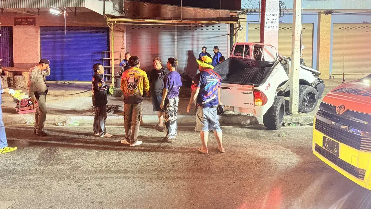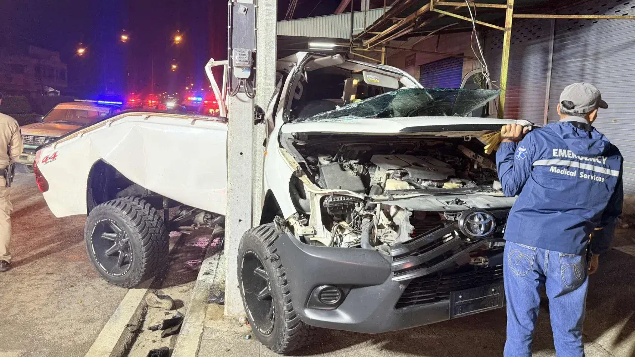 หนุ่มสุราษฯควบกระบะชนเสาไฟฟ้าหักกลางดับอึ้งค้นร่างพบยาบ้า และหมายจับ