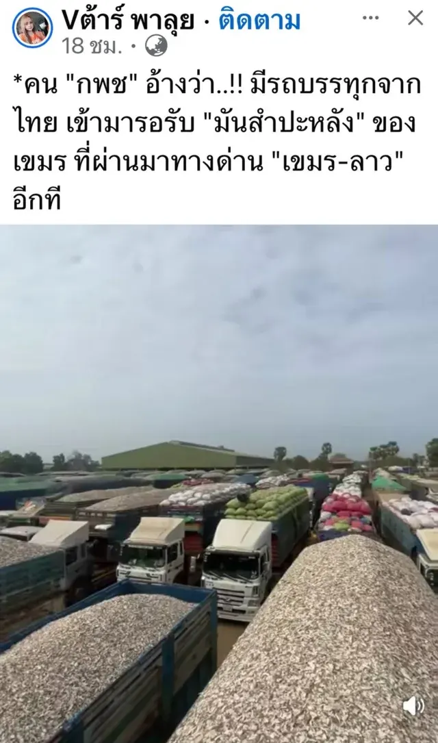 เกษตรกรผู้ปลูกมันสำปะหลังในประเทศไทยร้องเรียนหนัก หลังพบขบวนการนายทุนหัวใสเปลี่ยนวิธีใช้รถขนส่งข้ามพรมแดนจากกัมพูชาเข้าไปยัง สปป.ลาว แล้วจึงใช้สิทธิ์การนำเข้าจากประเทศลาวผ่านด่านชายแดนในจังหวัด อุบลราชธานี (ช่องเม็ก), มุกดาหาร และบึงกาฬ เพื่อตบตาเจ้าหน้าที่