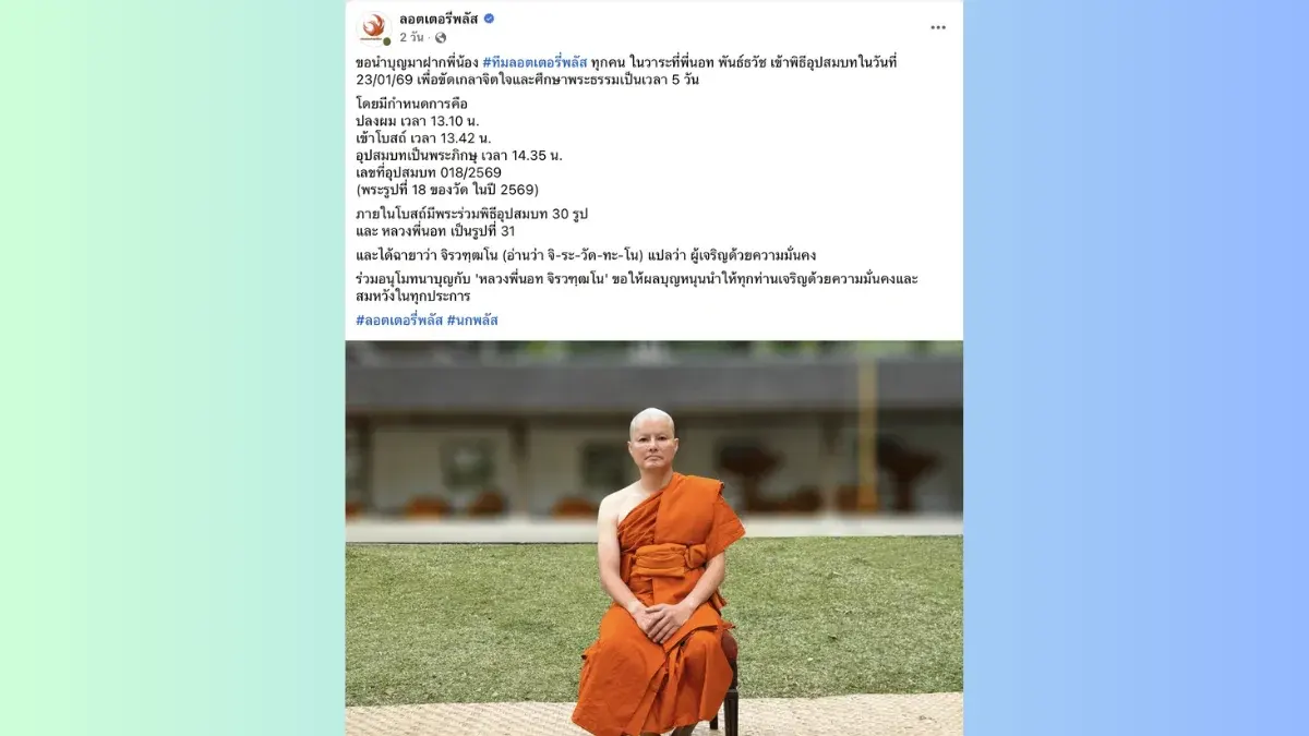 นอท ลอตเตอรี่พลัส เข้าสู่ร่มกาสาวพัสตร์ศึกษาธรรมะ คอหวยแห่ส่องเลขมงคลลุ้นงวด 1 ก.พ. 69