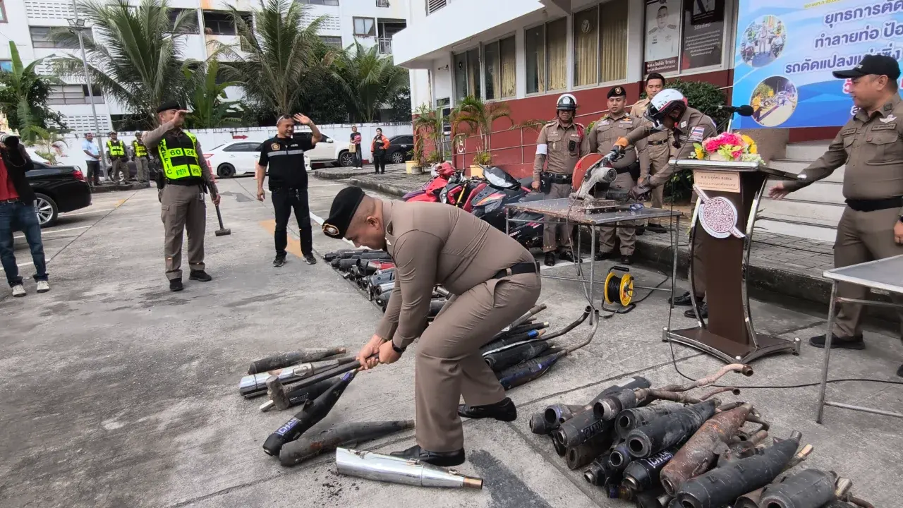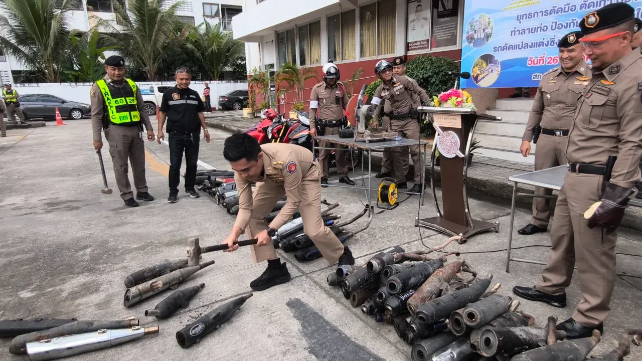 การแถลงข่าวครั้งนี้ มีการจัดเตรียมเครื่องมืออุปกรณ์ทำลาย ท่อไอเสียดัดแปลง ทั้งค้อนปอนส์ เครื่องตัดเหล็ก และภายหลังจากประธานแถลงข่าวแล้วเสร็จ มีการทุบทำลายท่อไอเสียโชว์ต่อหน้ผู้สื่อข่าว เพื่อเป็นสัญลักษณ์ มีนายตำรวจระดับสารวัตร รองผู้กำกับ ผู้กำกับ และรองผู้บังคับการจังหวัด โชว์ใช้ค้อนปอนส์ทุบท่อไอเสียต่อหน้าสื่อมวลชน แม้ว่าชุดที่สวมใส่ของตำรวจจะรัดแน่น แต่ก็ไม่เป็นอุปสรรค