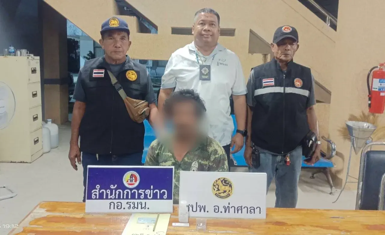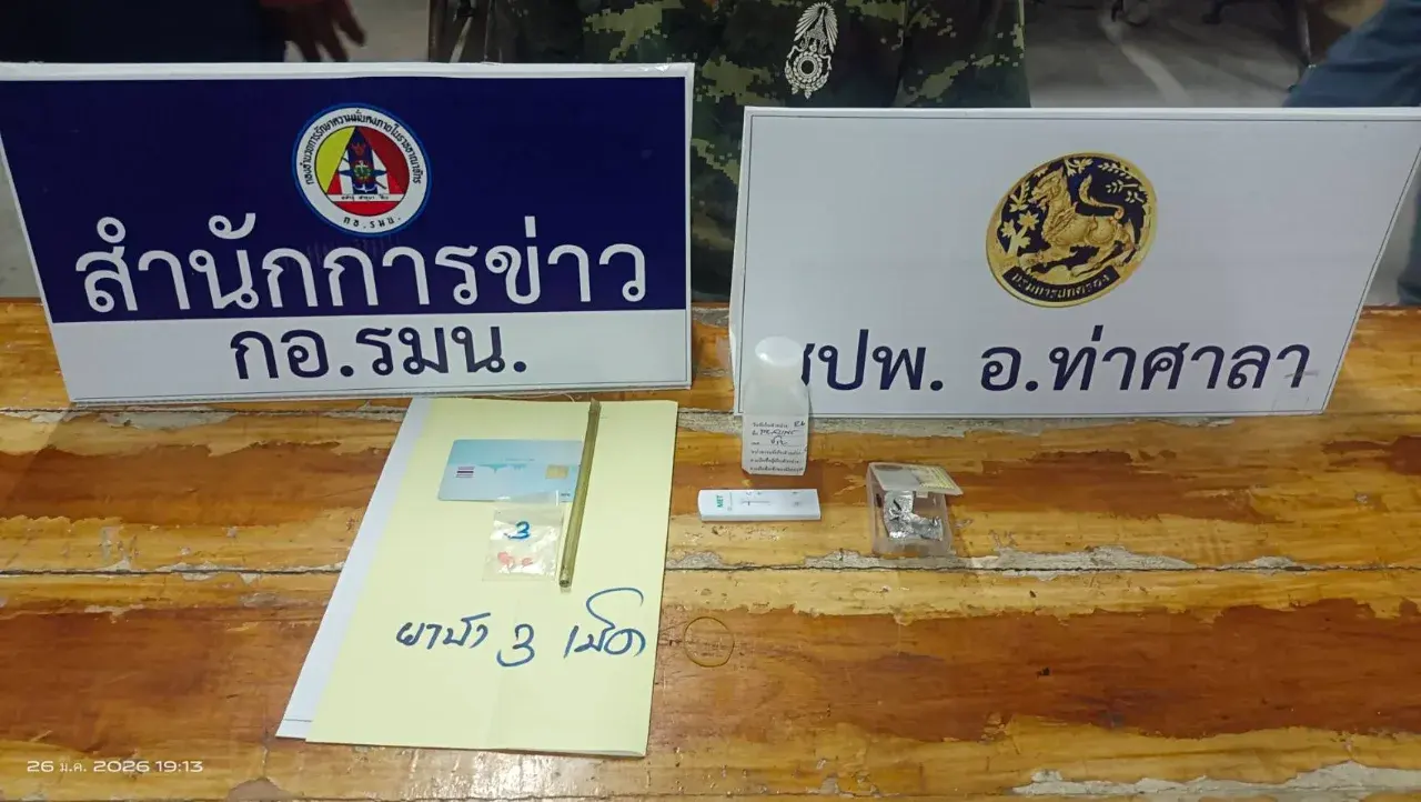 ระหว่างนั้นเจ้าหน้าที่พบว่านายสมพร หรือ “ ชาม ท่าขึ้น ” อายุ 39 ปี อยู่บ้านหมู่ 6 ต.ท่าขึ้น ท่าทางมีพิรุธ เมื่อเห็นเจ้าหน้าที่ได้ทิ้งวัตถุบางอย่างลงบนพื้นดิน ก่อนใช้เท้าไถทรายกลบ จึงเข้าควบคุมตัว สอบสวนช่วงแรกนายชาม อ้างว่าไม่มีอะไร ไม่ได้ทำอะไร แต่เจ้าหน้าที่ไม่ปักเชื่อ เพราะพฤติกรรมนายชาม มีพิรุธชัดเจน สุดท้ายเจ้าหน้าที่ตรวจสอบพื้นทราย พบยาบ้า 3 เม็ด บรรจุซองปิดผนึก จึงทำการจับกุมนำตัวสอบสวนขยายผล ตรวจปัสสาวะพบสารเสพติด ก่อนส่งพนักงานสอบสวน สภ.ท่าศาลา ดำเนินคดีตามกฎหมาย