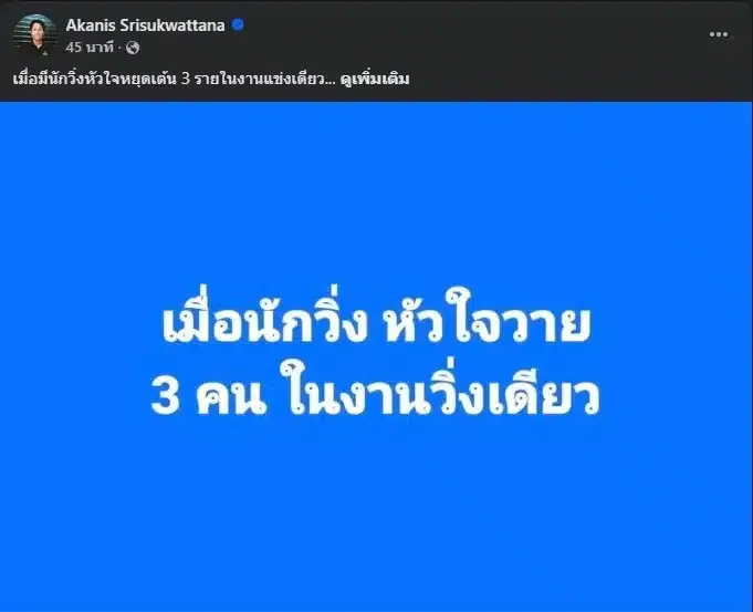เพจดังรายงานข่าวนักวิ่ง 3 คนหัวใจวายในงานเดียว แพทย์ชี้ไม่ใช่เรื่องบังเอิญ