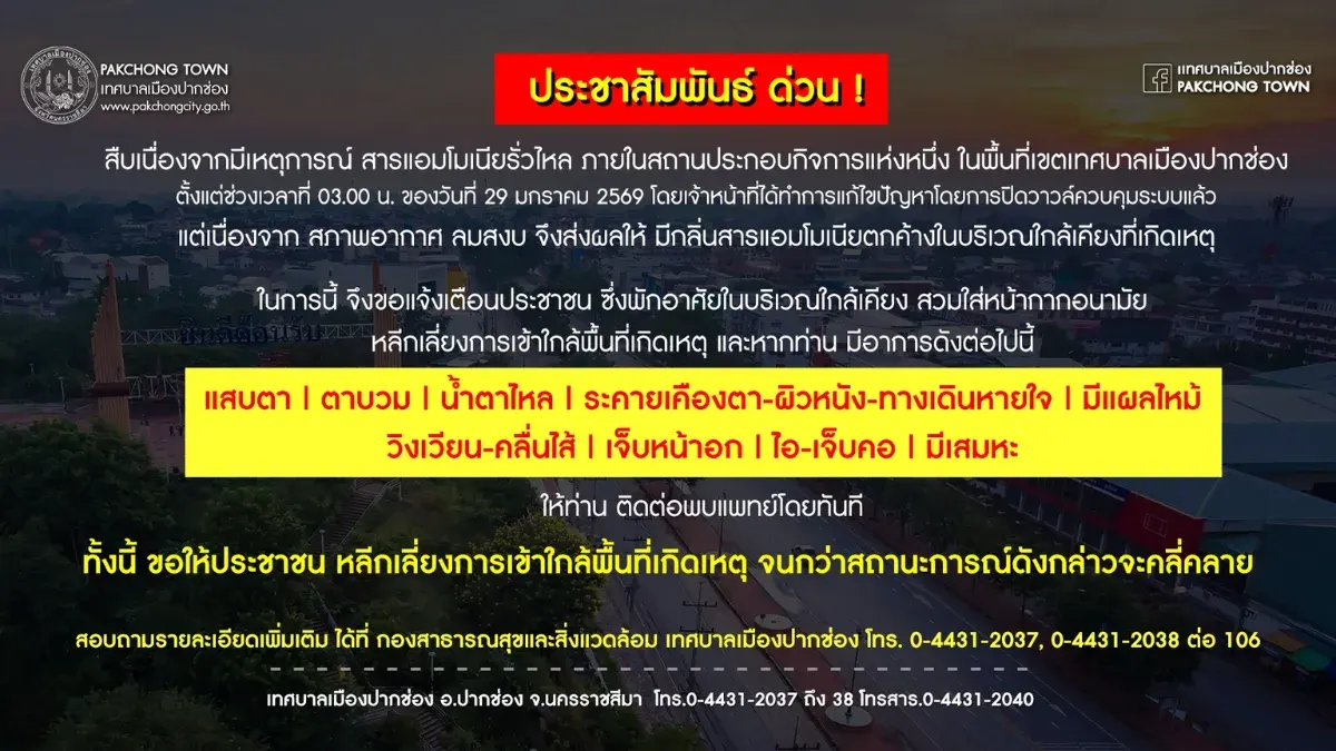 #เหตุฉุกเฉินปากช่อง #แอมโมเนียรั่วไหล #เทศบาลเมืองปากช่อง #ความปลอดภัยชุมชน #งานป้องกันและบรรเทาสาธารณภัย