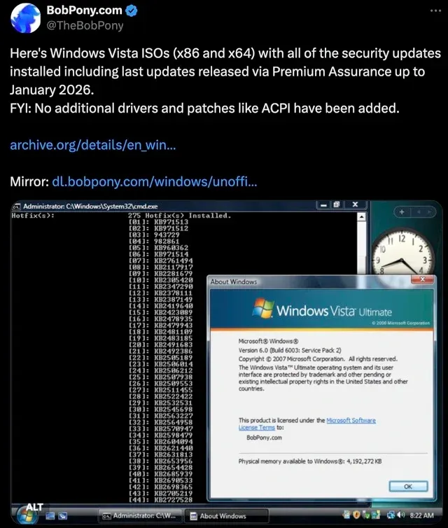 ไฟล์ ISO ที่มีการเผยแพร่นั้น ได้รวมการอัปเดตแพตช์สำคัญที่สุดเท่าที่สามารถทำได้ ตัวอย่างเช่น Windows Vista ได้รับการอัปเดตแพตช์ความปลอดภัย จนถึงเดือนมกราคม ค.ศ. 2026 ผ่านโครงการ "การอัปเดตข้อมูลประกันภัยระดับพรีเมียม" ซึ่งช่วยให้ขั้นตอนการติดตั้งสะดวกมากขึ้น เมื่อเทียบกับการต้องค้นหาและติดตั้งแพตช์ทีละรายการเช่นในอดีต อย่างไรก็ตาม การมีแพตช์เหล่านี้ ไม่ได้หมายความว่าระบบปฏิบัติการจะมีความปลอดภัย เทียบเท่ากับ Windows รุ่นปัจจุบัน