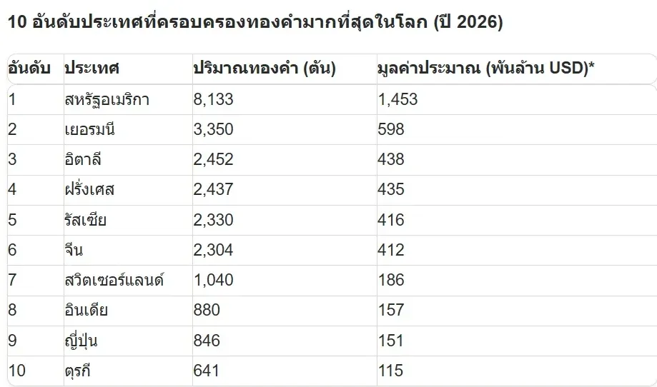 เผย 10 อันดับประเทศที่มี "ทองคำ" มากที่สุดในโลก..ประจำปี 2026 เรียกว่าราคาทองคำตอนนี้ก็พุ่งไม่หยุดฉุดไม่อยู่เลยจริงๆ และจากข้อมูลล่าสุดประจำปี 2026 นี้ ประเทศที่ตุนทองคำไว้มากที่สุดในโลกมีใครบ้าง วันนี้เราจะมาส่อง 10 อันดับที่มีทองคำมากที่สุดในโลก งานนี้ก็ไม่พ้นพี่ใหญ่อย่าง "สหรัฐอเมริกา" ที่ยังคงครองแชมป์เบอร์หนึ่ง รวยอู้ฟู่ไปเลยหลังราคาทองคำตอนนี้กลับพุ่งทะยานขึ้นอย่างต่อเนื่อง