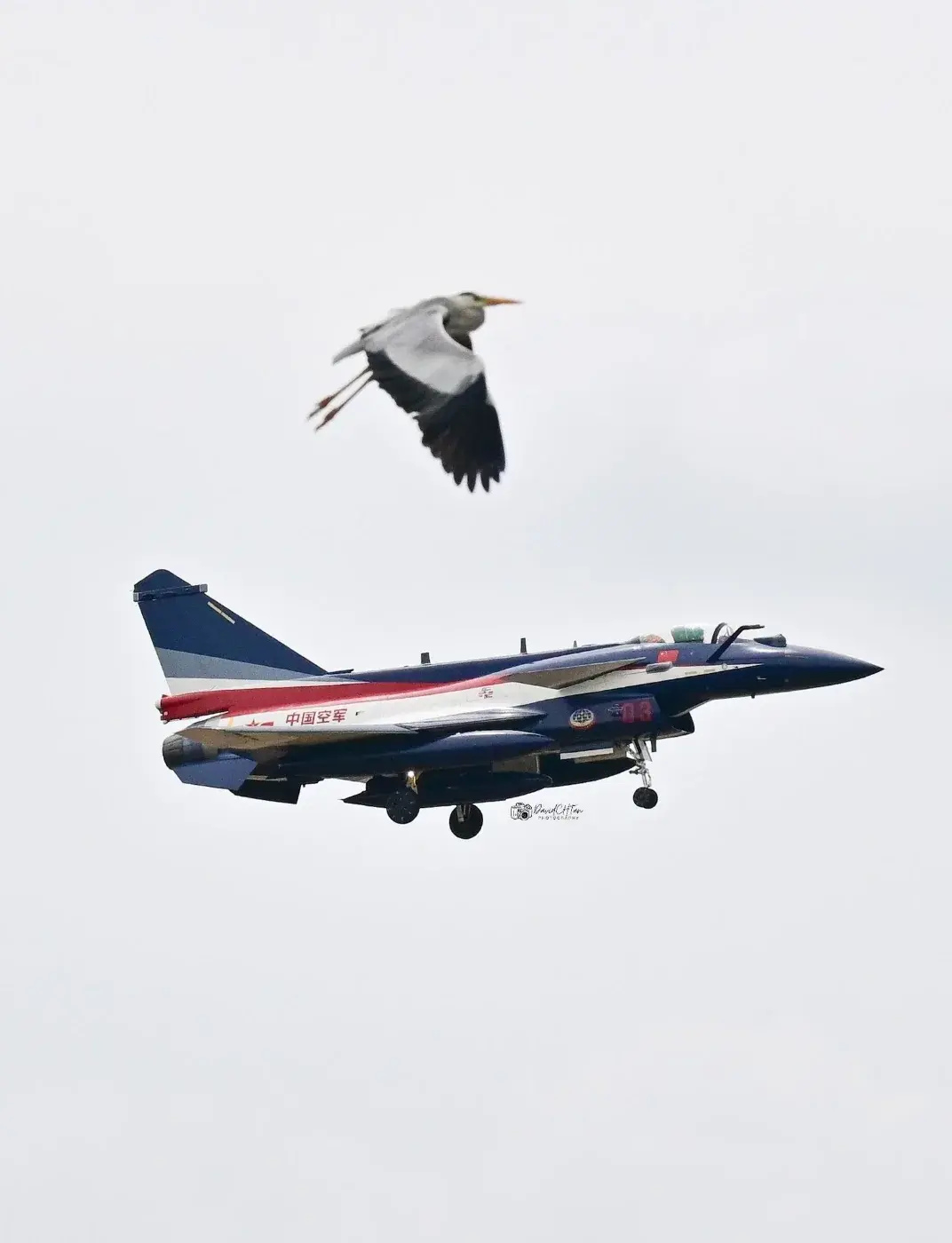 "เดวิด ตัน" ถ่ายภาพเครื่องบินขับไล่ J-10 แต่ละลำ ขณะลดระดับลงสู่สนามบินชางงี อย่างไรก็ตาม เขาไม่สามารถถ่ายภาพขณะลงจอดจริงได้ เนื่องจากข้อจำกัดด้านการถ่ายภาพ และ ในขณะที่เขากำลังถ่ายภาพเครื่องบินลำรองสุดท้ายของขบวน เมื่อเวลาประมาณ 14.40 น. เขาได้กดชัตเตอร์แบบถ่ายรัว ซึ่งในช่วงจังหวะเดียวกันนั้นเอง นกกระยางสีเทาท้องถิ่นตัวหนึ่ง ได้บินเข้าสู่กรอบภาพ และ ดูราวกับบินเคียงข้างเครื่องบินขับไล่ลำดังกล่าว หลังจากปรากฏในภาพร่วมกันเพียงชั่วขณะ ทั้งสองก็แยกจากกัน เครื่องบินยังคงลดระดับเพื่อลงจอด ในขณะที่นกกระยางบินสูงขึ้นและหายไปจากสายตา