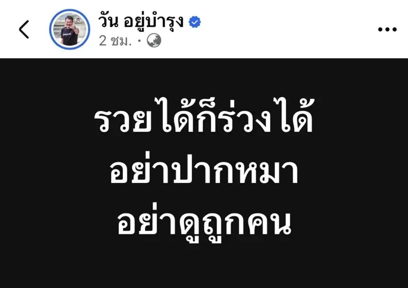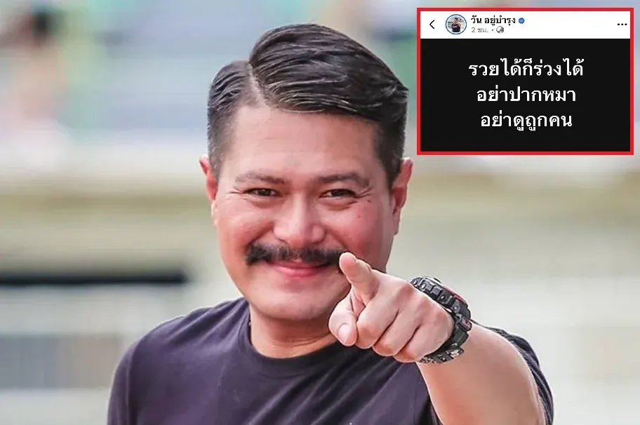 ล่าสุด เมื่อวันที่ 30 ม.ค.69 ที่ผ่านมา ในเฟซบุ๊คส่วนตัว "วัน อยู่บำรุง" นักการเมืองชื่อดังฝั่งธนฯ ก็รีบออกมาเคลื่อนไหวเกี่ยวกับประเด็นดังกล่าว โดยโพสต์ข้อความสั้นๆ แต่มันได้รับความสนใจเป็นอย่างมาก ซึ่งระบุว่า “รวยได้ก็ร่วงได้ อย่าปากหมา ดูถูกคน”