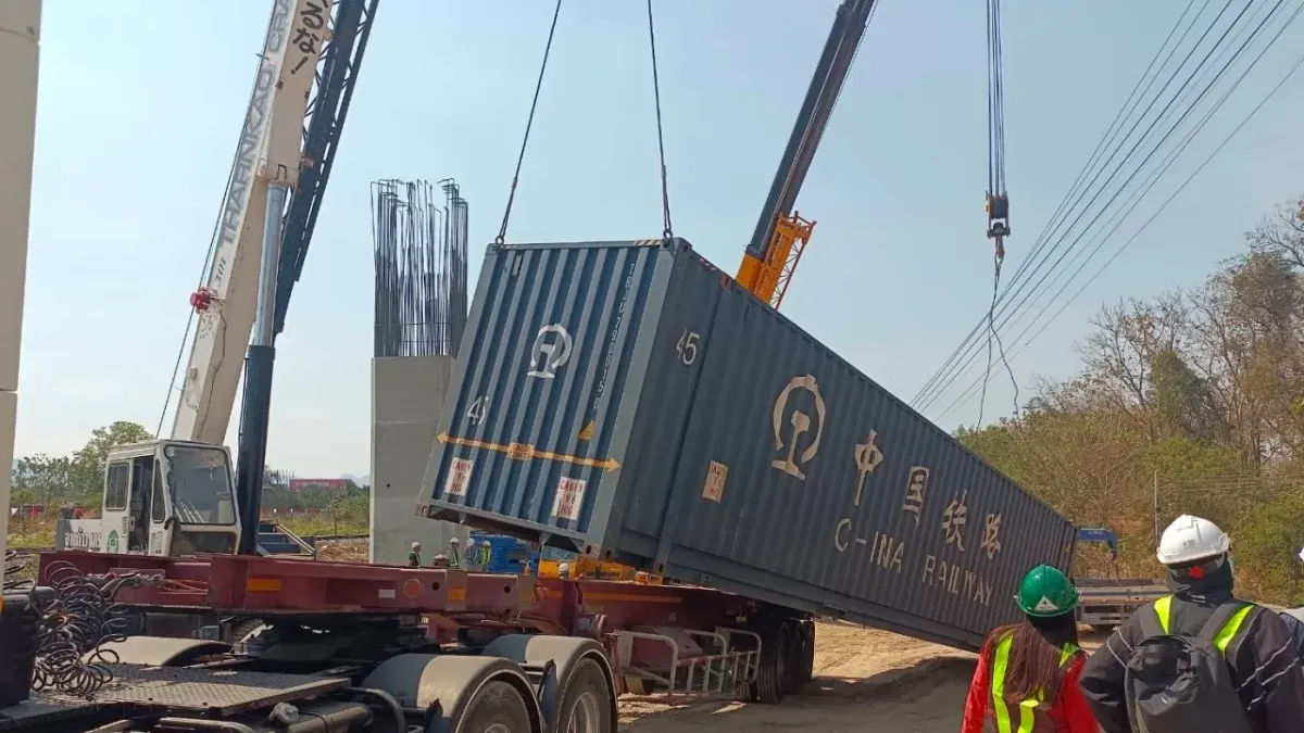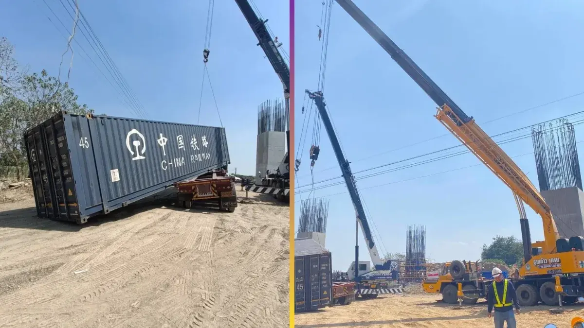 ระทึกปากช่อง! เครนยกตู้คอนเทนเนอร์ไซต์งานรถไฟความเร็วสูงหัก หล่นทับรถเทรลเลอร์พังยับ