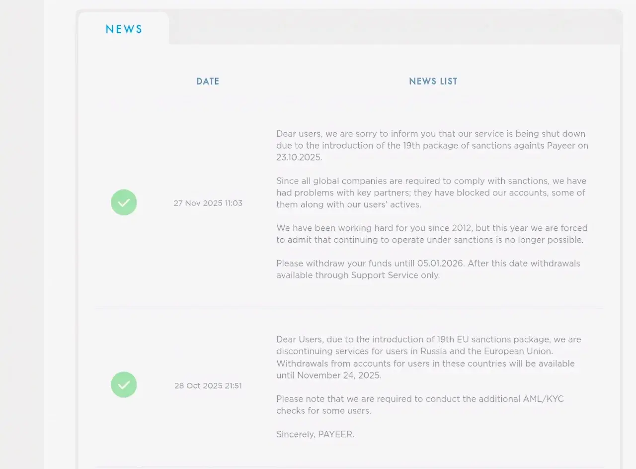 เนื่องจากการบังคับใช้มาตรการคว่ำบาตรชุดที่ 19 ต่อ Payeer ในวันที่ 23 ตุลาคม 2568