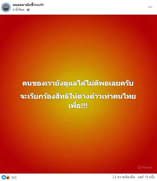 - "คนของเรายังดูแลได้ไม่ดีพอเลย จะเรียกร้องสิทธิ์ให้ต่างด้าวเท่าคนไทย..เพื่อ!!!!"