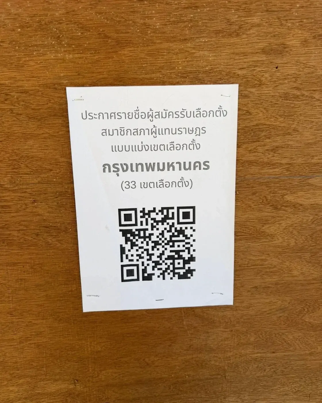 ตามปกติแล้ว หน้าหน่วยเลือกตั้งจะมีป้ายไวนิลหรือบอร์ดประชาสัมพันธ์ ข้อมูลผู้สมัคร สส. ในเขตนั้นๆ เพื่อให้ประชาชนได้ตรวจสอบข้อมูลก่อนเข้าคูหา ซึ่งในยุคดิจิทัลแบบนี้ (ปี 2026 แล้วนะเห้ย!) ก็มักจะมี QR Code แปะไว้เพื่อให้สแกนดูรายละเอียดเพิ่มเติมทางออนไลน์ได้ง่ายๆ