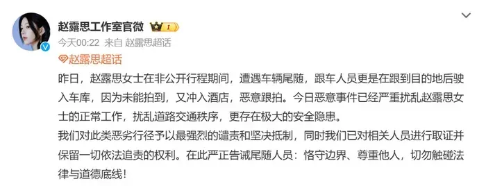 "จ้าว ลูซือ" ถูกยานพาหนะต้องสงสัยติดตามตลอดการเดินทางส่วนตัว ไม่เพียงแต่ติดตามไปจนถึงจุดหมายปลายทางเท่านั้น แต่ยังบุกรุกเข้าไปในบริเวณลานจอดรถ ซึ่งส่งผลกระทบอย่างร้ายแรงต่อพื้นที่ส่วนตัวของนักแสดงหญิงรายนี้ ที่น่ากังวลยิ่งไปกว่านั้นคือ เมื่อไม่สามารถถ่ายภาพจากภายนอกได้ ผู้ติดตามรายดังกล่าวยังได้บุกเข้าไปในโรงแรม เพื่อบันทึกภาพโดยมิชอบด้วยกฎหมาย ทางสตูดิโอเห็นว่า "นี่เป็นพฤติกรรมคุกคามที่มีเจตนา มันชัดเจนว่าเกินขอบเขตที่ยอมรับได้ และ แฝงไปด้วยความเสี่ยงต่อความปลอดภัย!!"