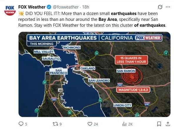 เมื่อวันที่ 2 กุมภาพันธ์ เกิดแผ่นดินไหวมากกว่า 40 ครั้งในบริเวณอ่าวซานฟรานซิสโก รัฐแคลิฟอร์เนีย ทำให้เกิดปรากฏการณ์ "แผ่นดินไหวแบบกลุ่ม" อย่างชัดเจน จุดศูนย์กลางแผ่นดินไหวส่วนใหญ่อยู่ในพื้นที่ซานราโมน โดยแผ่นดินไหวที่รุนแรงที่สุดวัดได้ 4.2 ริกเตอร์ แรงสั่นสะเทือนส่งผลกระทบต่อหลายเมือง ผู้เชี่ยวชาญจากสำนักงานสำรวจทางธรณีวิทยาแห่งสหรัฐอเมริกา (USGS) ชี้ว่ากิจกรรมแผ่นดินไหวนี้ยังคงดำเนินต่อไป และขณะนี้ยังไม่สามารถคาดการณ์ได้ว่าจะสิ้นสุดเมื่อใด ทำให้เกิดความกังวลอย่างมากในหมู่ประชาชนในพื้นที่และผู้เชี่ยวชาญเกี่ยวกับเสถียรภาพทางธรณีวิทยา