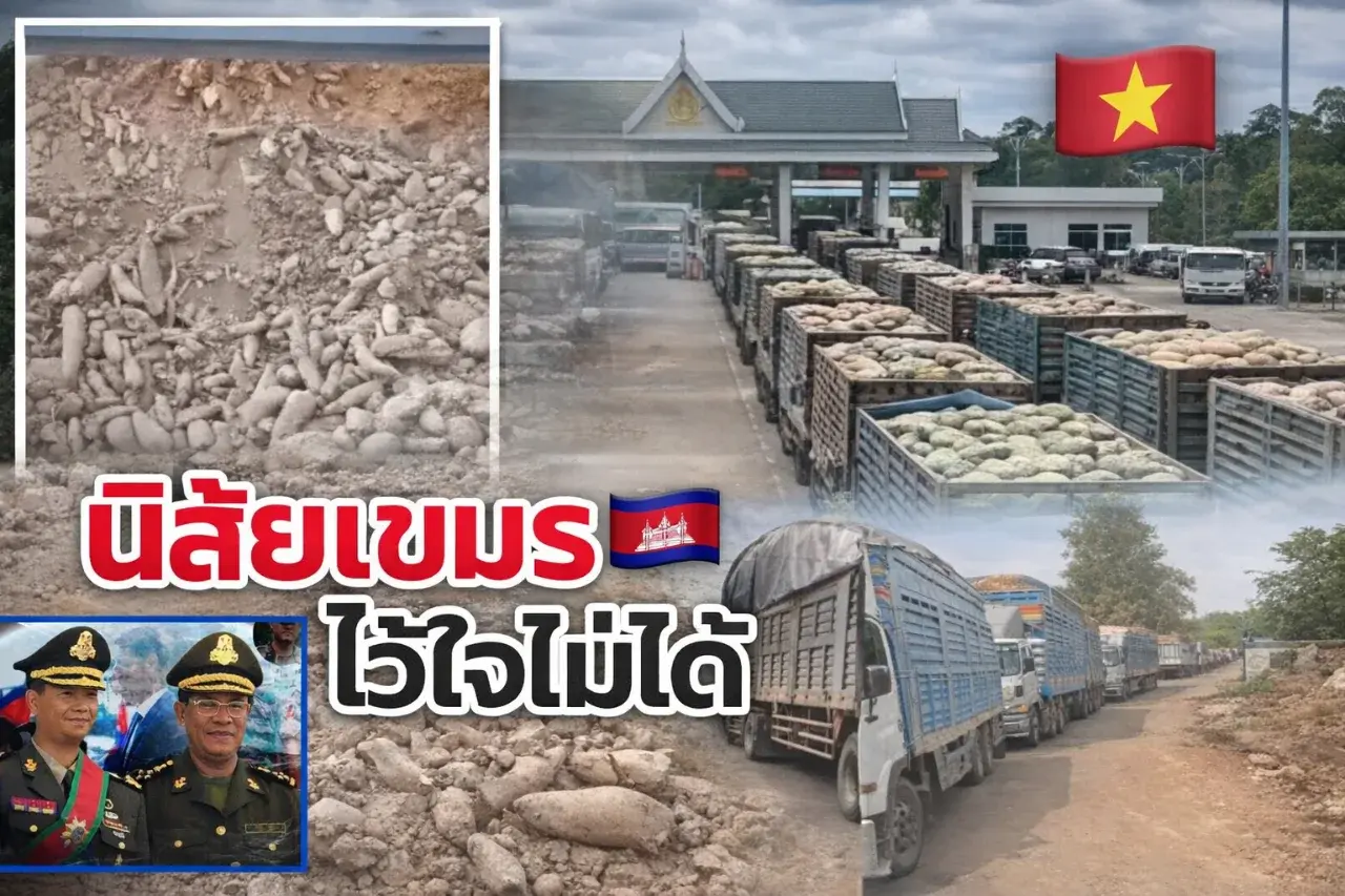 เพจดังเผยภาพ รถบรรทุกมันสำปะหลังจากกัมพูชาจอดยาวเหยียดกว่า 2 กิโลเมตร บริเวณด่านชายแดน