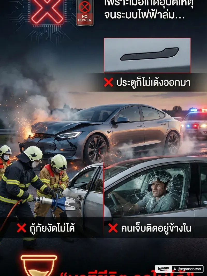- เมื่อระบบไฟฟ้าล่ม = ประตูตายสนิท: ในกรณีที่เกิดอุบัติเหตุรุนแรง รถยนต์สมัยใหม่จะมีระบบตัดไฟอัตโนมัติเพื่อป้องกันไฟไหม้ ปัญหาคือมือจับประตูแบบซ่อนส่วนใหญ่ต้องใช้ไฟฟ้าในการ "ดัน" ตัวเองออกมาให้คนจับ หากไฟตัด มือจับก็ยังคงจมอยู่ในตัวรถ