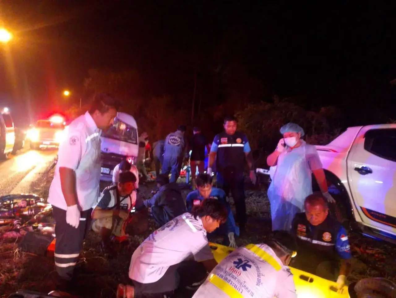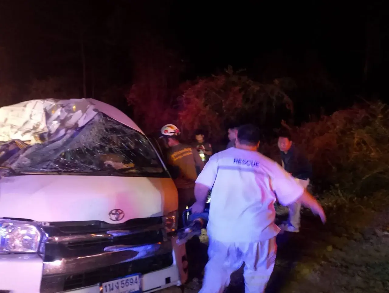 ที่เกิดเหตุพบผู้บาดเจ็บภายในรถตู้รวม 11 ราย แบ่งเป็นหญิง 5 ราย ชาย 6 ราย บางรายมีอาการสาหัส หมดสติ และติดอยู่ในซากรถ เจ้าหน้าที่ต้องใช้เครื่องตัดถ่างเข้าช่วยเหลือท่ามกลางความมืดและความยากลำบาก