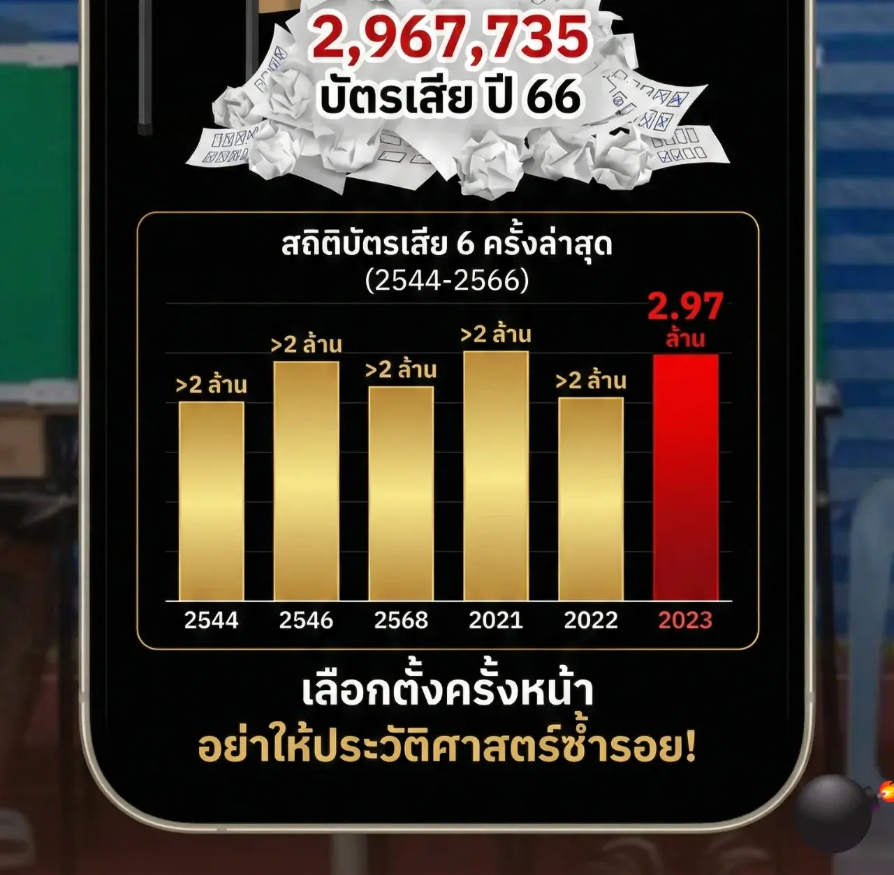 "รู้หรือไม่? ในการเลือกตั้งทั่วไป 6 ครั้งล่าสุดของไทย มีจำนวนบัตรเสียมากกว่า 2 ล้านใบทุกครั้ง!"