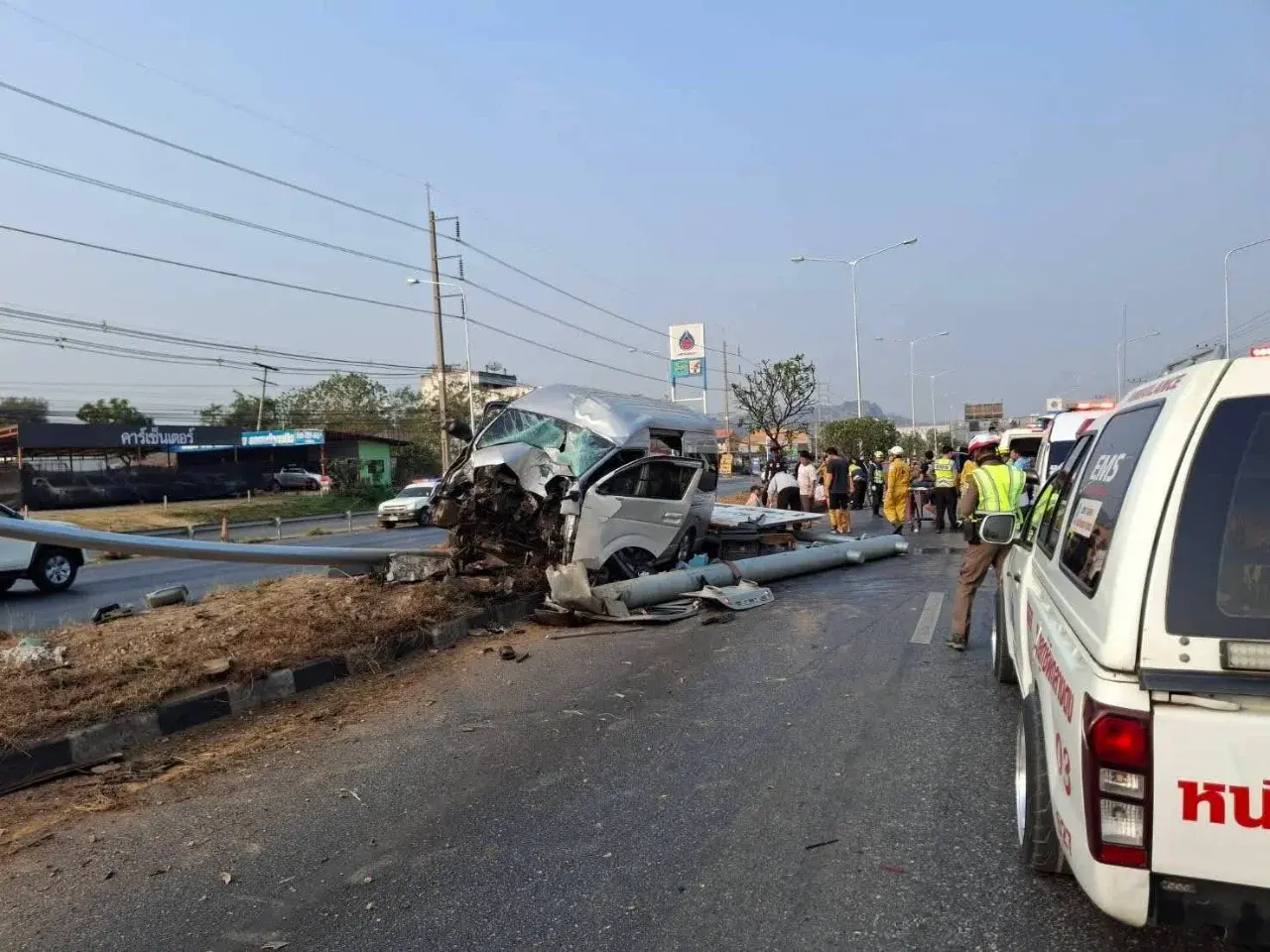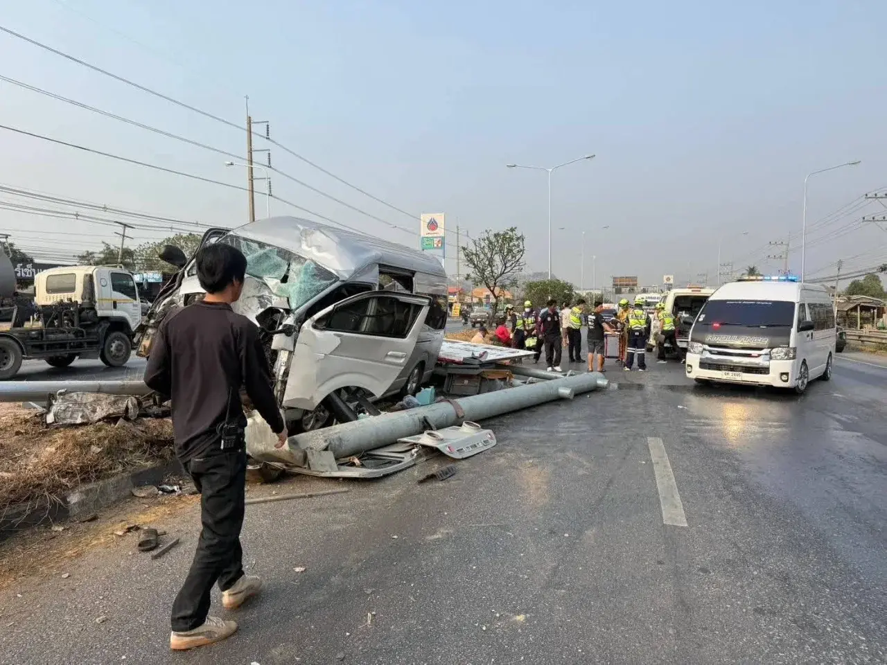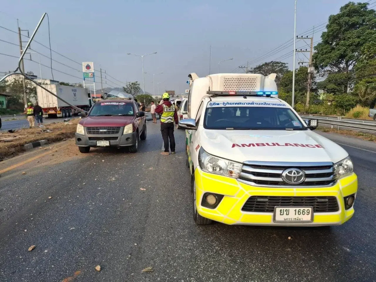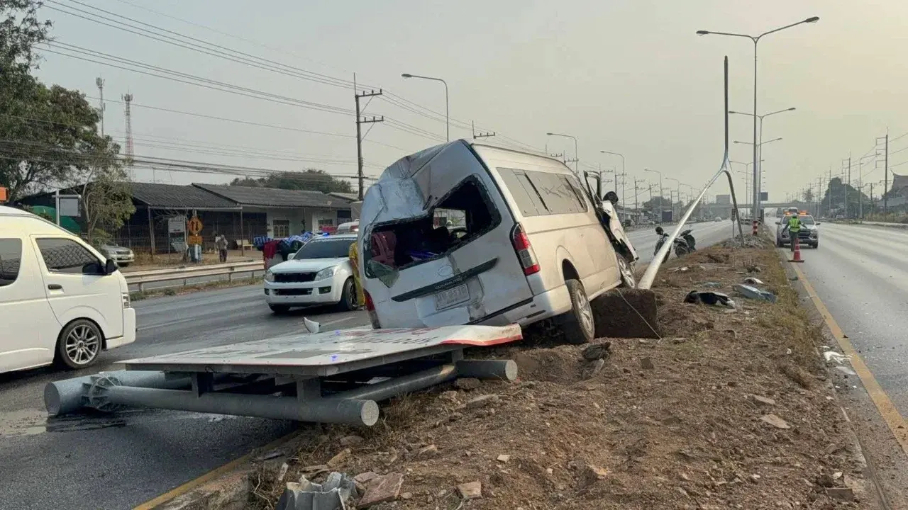 เมื่อเวลา 08.20 น. วันที่ 8 กุมภาพันธ์ 2569 ที่ผ่านมา พ.ต.ท. สายชล ดงเรืองศรี สว.(สอบสวน) สภ.กลางดง อำเภอปากช่อง จังหวัดนครราชสีมา รับแจ้งเหตุรถตู้หลับใน ขึ้นเกาะกลางถนนชนเสาไฟฟ้าและป้ายบอกทางของกรมทางหลวง มีผู้ได้รับบาดเจ็บหลายราย เหตุเกิดบนถนนมิตรภาพ ช่วงกิโลเมตรที่ 39–40 ขาเข้านครราชสีมา ตำบลพญาเย็น อำเภอปากช่อง จังหวัดนครราชสีมา