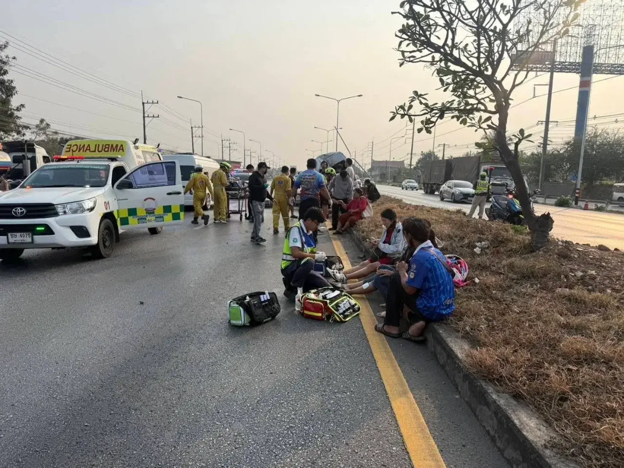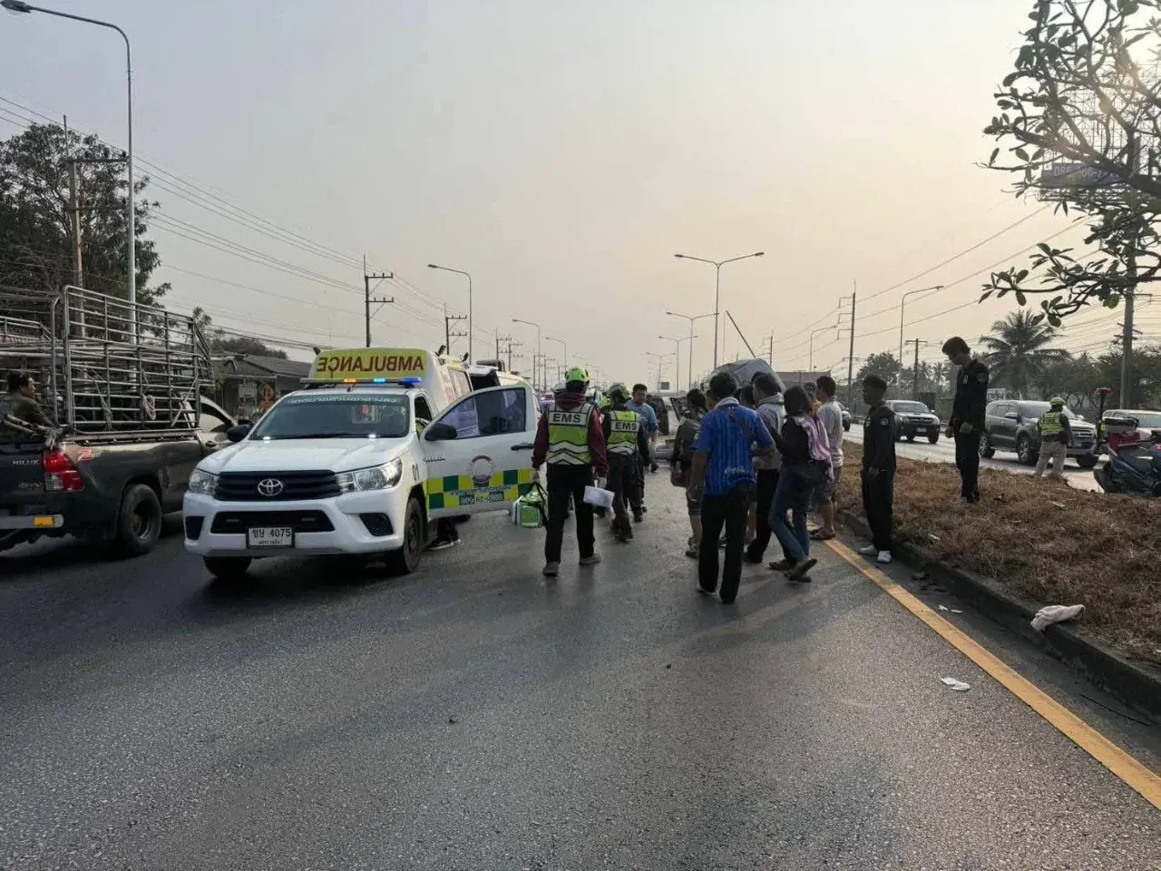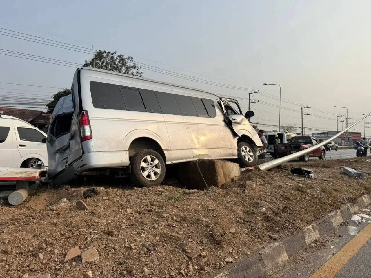 เมื่อเวลา 08.20 น. วันที่ 8 กุมภาพันธ์ 2569 ที่ผ่านมา พ.ต.ท. สายชล ดงเรืองศรี สว.(สอบสวน) สภ.กลางดง อำเภอปากช่อง จังหวัดนครราชสีมา รับแจ้งเหตุรถตู้หลับใน ขึ้นเกาะกลางถนนชนเสาไฟฟ้าและป้ายบอกทางของกรมทางหลวง มีผู้ได้รับบาดเจ็บหลายราย เหตุเกิดบนถนนมิตรภาพ ช่วงกิโลเมตรที่ 39–40 ขาเข้านครราชสีมา ตำบลพญาเย็น อำเภอปากช่อง จังหวัดนครราชสีมา