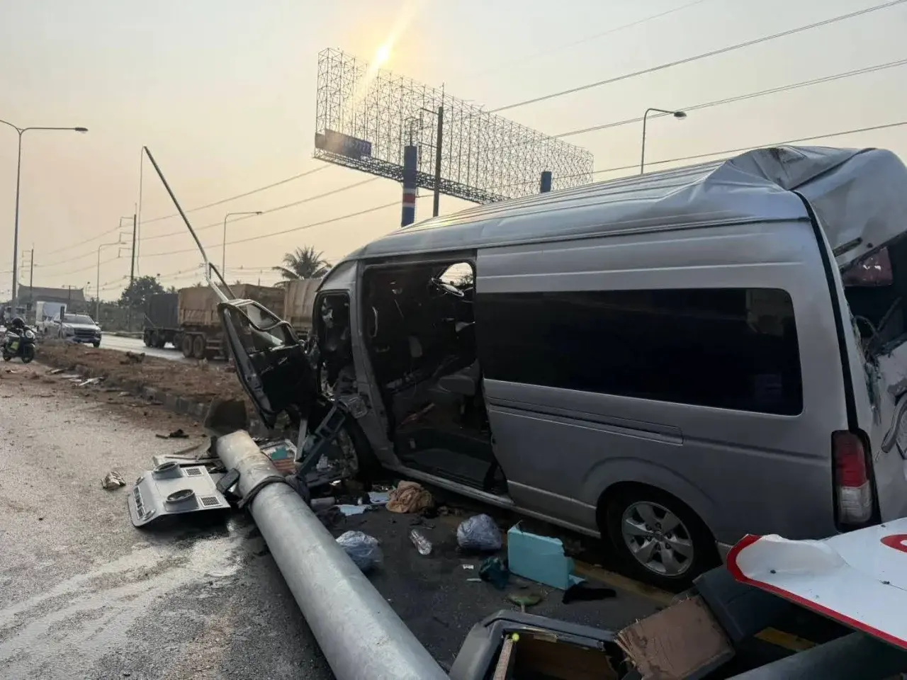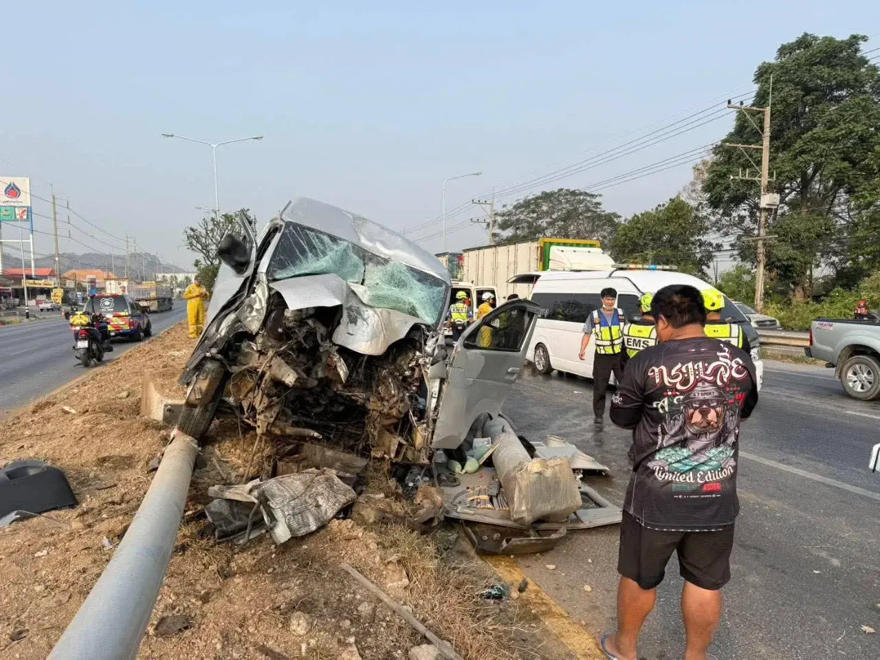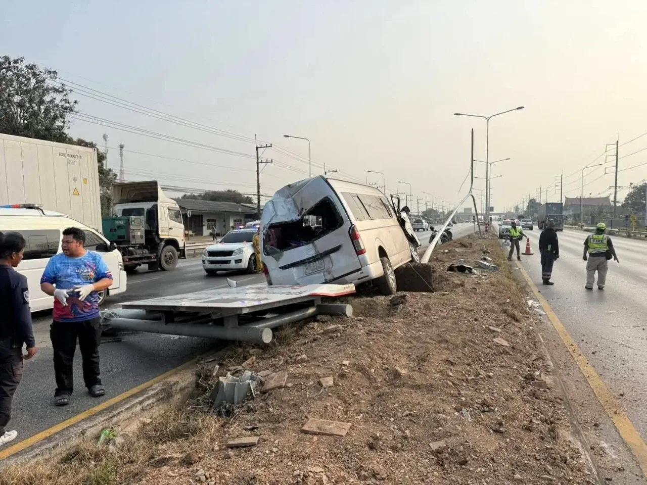 ที่เกิดเหตุพบรถตู้โตโยต้า สีบรอนซ์ ทะเบียน นข 5110 อุดรธานี อยู่บนเกาะกลางถนน สภาพด้านหน้ารถพังเสียหายอย่างหนัก ชนติดกับเสาเหล็กป้ายบอกทางขนาดใหญ่ของกรมทางหลวง โดยผู้ขับขี่ถูกอัดติดอยู่กับเบาะคนขับ เจ้าหน้าที่กู้ชีพต้องใช้เครื่องตัดถ่างเพื่อนำร่างออกมา
