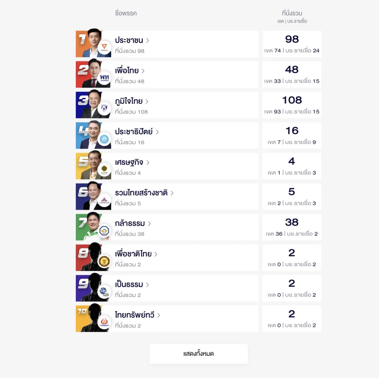 พรรคประชาชนนำเป็นอันดับ 1 สำหรับแบบ บช. รายชื่อ ตามด้วยเพื่อไทย ภูมิใจไทย ประชาธิปัตย์ เศรษฐกิจ รวมไทยสร้างชาติ กล้าทำ เพื่อชาติไทย เป็นธรรม