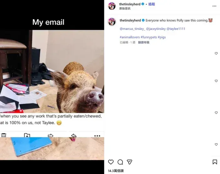 คลิปวิดีโอดังกล่าวถูกครอบครัวของ "ทินสลีย์" นำไปเผยแพร่บน Instagram และ TikTok ปัจจุบันมียอดรับชมมากกว่า 1.5 ล้านครั้ง โดยในคลิป "โพลี่" [ชื่อหมู] แสดงพฤติกรรมอย่างมืออาชีพ ด้วยการใช้จมูกคุ้ยกระเป๋าเป้ ดึงการบ้านออกมา ก่อนจะฉีกเป็นชิ้นๆ และ กินเข้าไปจนไม่เหลือซาก [ไม่เหลือแม้แต่แผ่นเดียว]