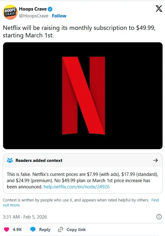 โดยโพสต์หนึ่งบนแพลตฟอร์ม X ซึ่งมียอดเข้าชมมากกว่า 6 ล้านครั้ง ระบุว่า "Netflix จะขึ้นค่าบริการรายเดือนเป็น 49.99 ดอลลาร์ โดยเริ่มต้นตั้งแต่วันที่ 1 มีนาคม 2026 เป็นต้นไป" ถึงแม้จะมีผู้ใช้งานจำนวนมากแชร์ต่อ รวมถึงผู้ว่าการรัฐฟลอริดา แต่ไม่พบหลักฐานว่า "เน็ตฟลิกซ์" จะปรับราคาขึ้นเป็น 49.99 ดอลลาร์ในเดือนมีนาคม 2026"