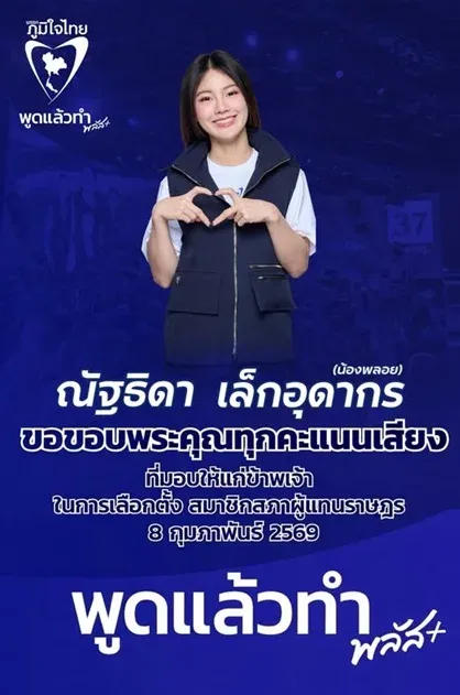 สาวหน้าใส! ว่าที่ สส.อายุน้อย "พลอย ณัฐธิดา"..คว้าชัยเลือกตั้งบุรีรัมย์ เขต 2 ปี 2569 ในนามพรรคภูมิใจไทย และได้กลายเป็นว่าที่ สส.ที่อายุน้อยที่สุดในขณะนี้