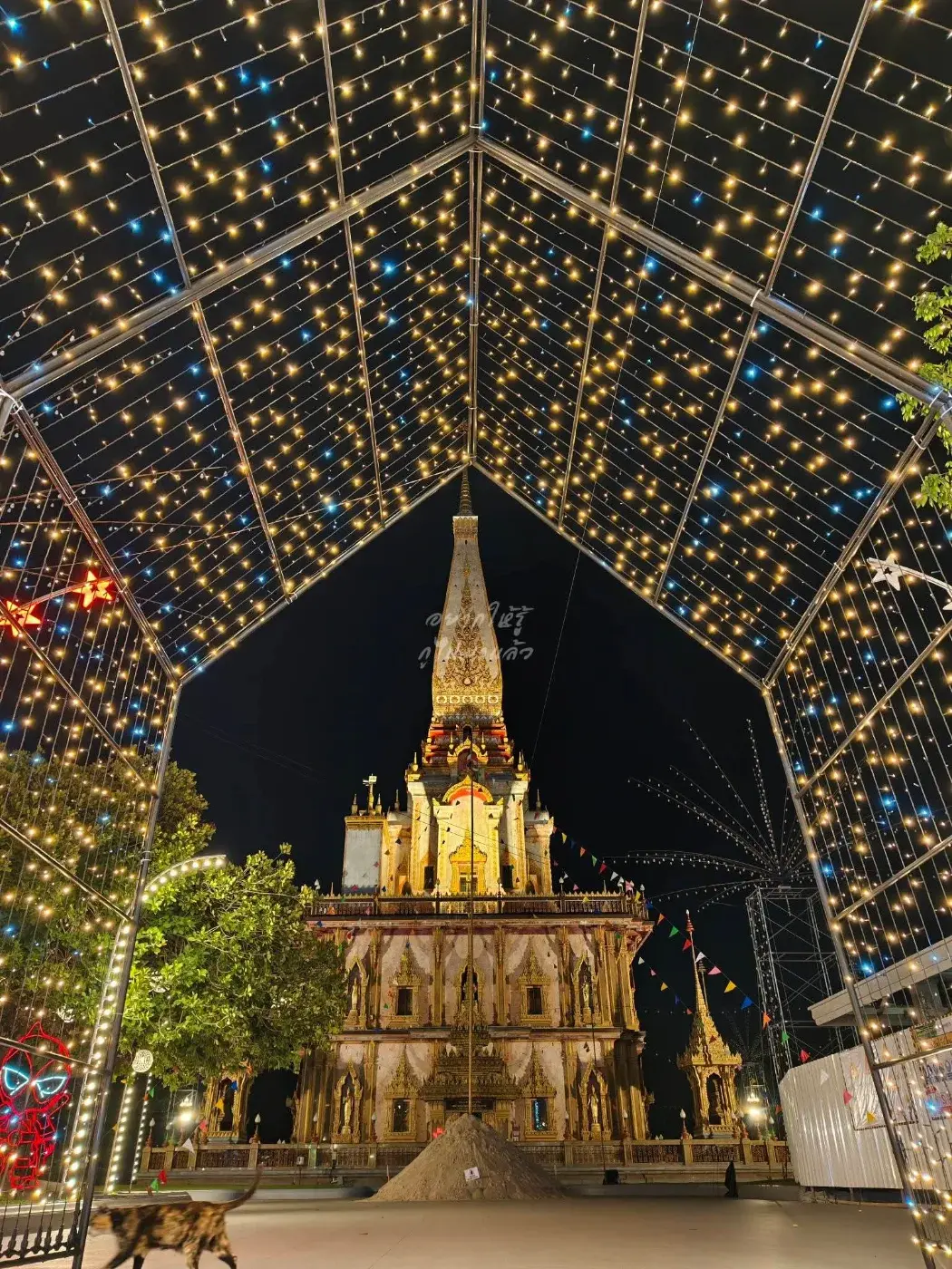ค่ำคืนหนึ่งในเดือนกุมภาพันธ์ ลมทะเลพัดเอื่อยผ่านย่านฉลอง พร้อมกับแสงไฟนับหมื่นดวงที่ค่อย ๆ ถูกจุดขึ้นทีละดวง ลานกว้างของ วัดไชยธาราราม (วัดฉลอง) เริ่มเปล่งประกายราวกับเมืองแห่งแสง สีทองของไฟประดับสะท้อนองค์พระอุโบสถอย่างงดงาม ราวกับกำลังบอกทุกคนว่า… งานวัดประจำปีที่หลายคนรอคอยกำลังจะกลับมาอีกครั้ง