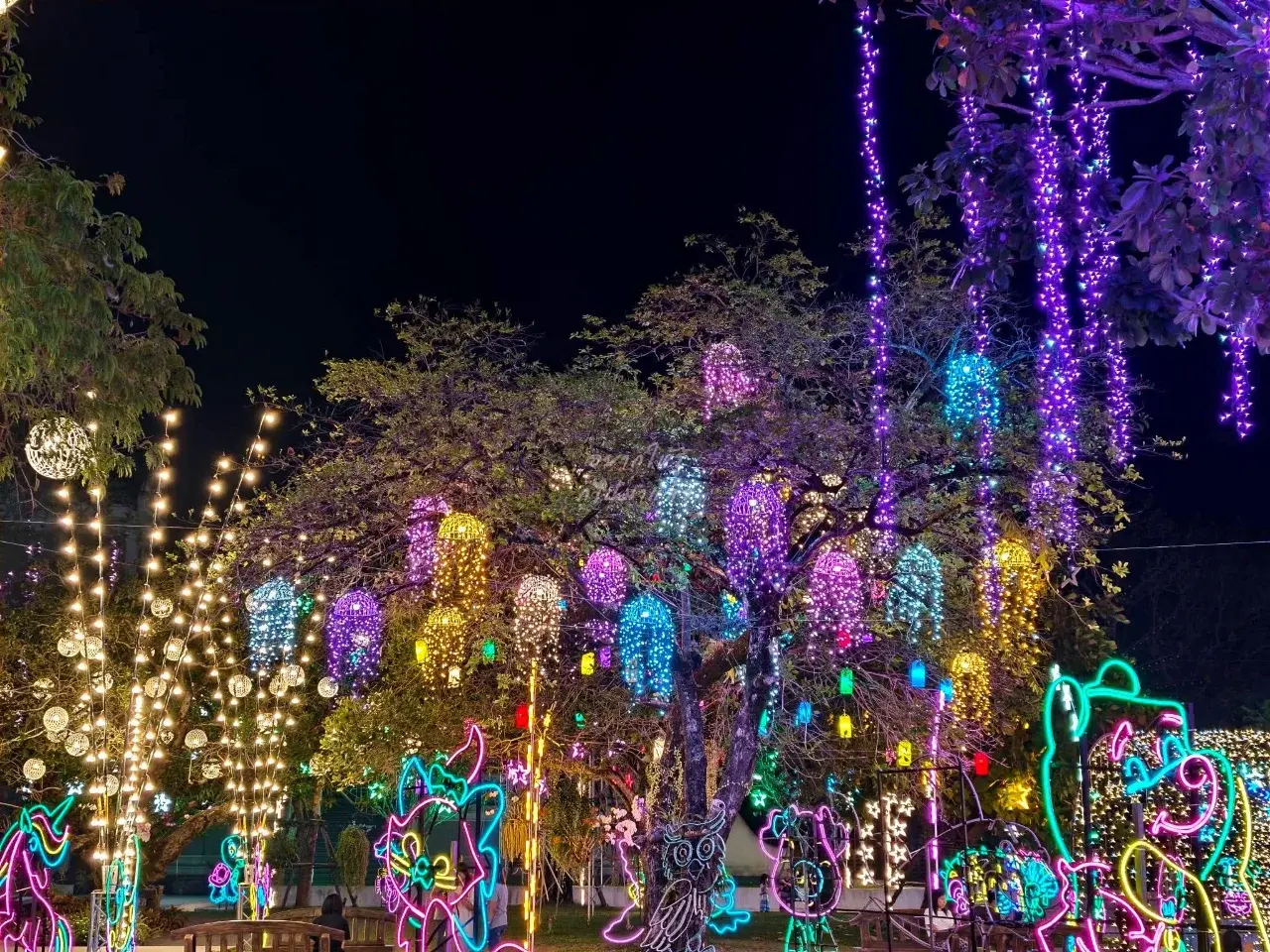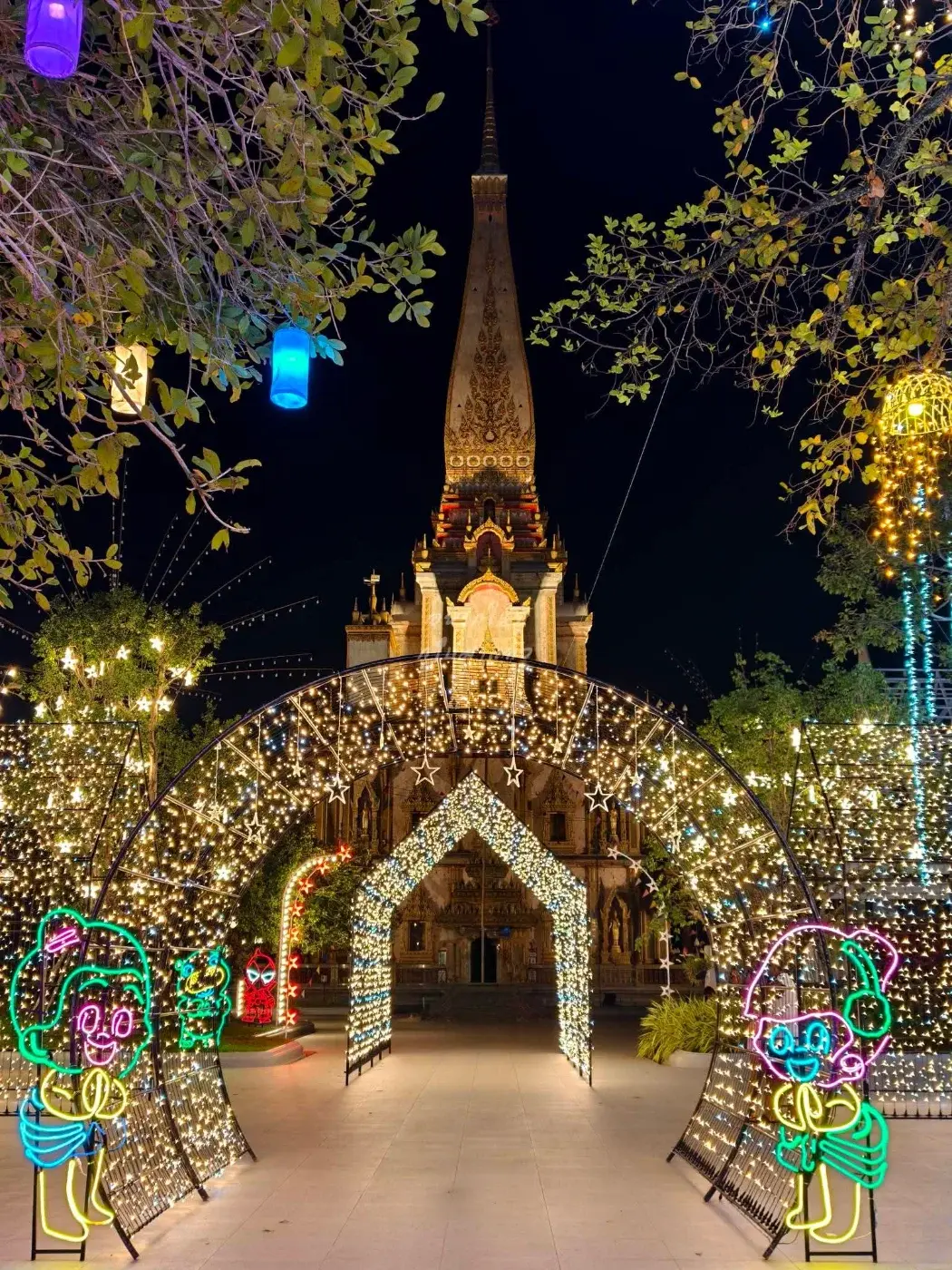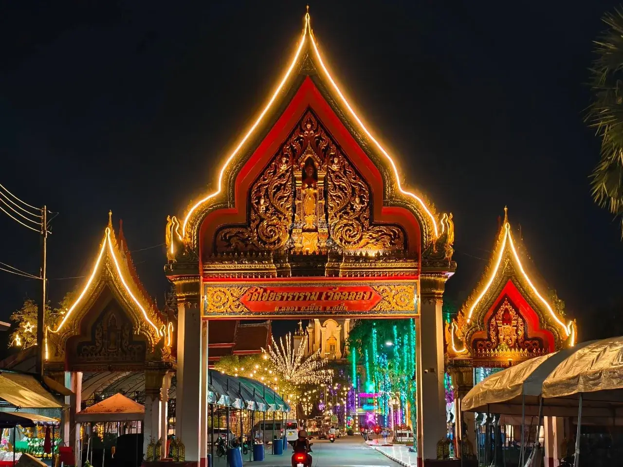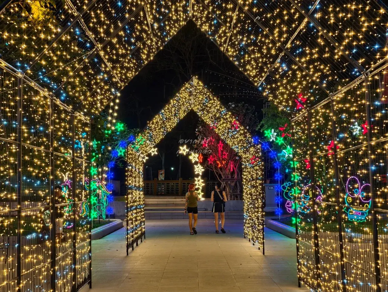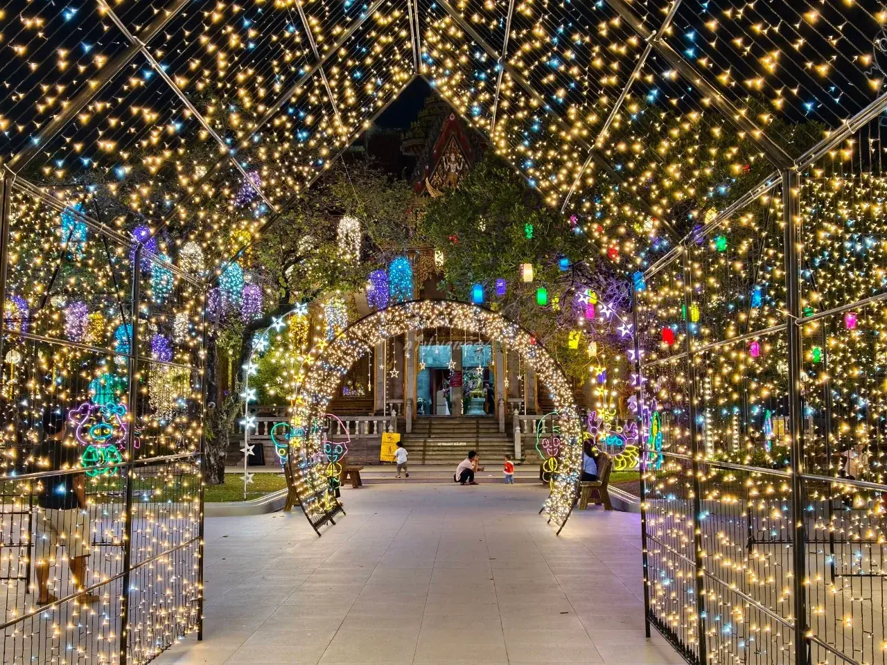 ครั้นแสงแดดอ่อนตัวลง เสียงดนตรีจากเวทีกลางเริ่มดังขึ้น ไฟประดับเปลี่ยนลานวัดให้กลายเป็นทะเลแห่งสีสัน อุโมงค์ไฟทอดยาวรอผู้คนเดินผ่าน เสียงเด็ก ๆ หัวเราะขณะถือสายไหมสีชมพู สายถ่ายภาพหยิบกล้องขึ้นมาบันทึกทุกมุม เพราะไม่ว่าหันไปทางไหนก็สวยจับตา