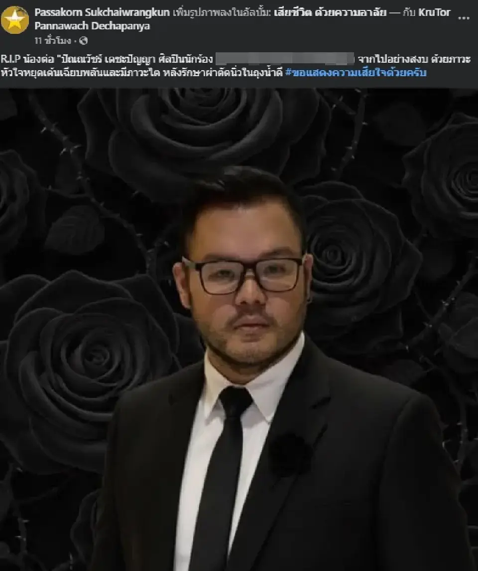 ในโพสต์ระบุว่า R.I.P น้องต่อ ปัณณวัชร์ เดชะปัญญา จากไปอย่างสงบ โดยเขาเป็นเจ้าของบทเพลงที่หลายคนรู้จัก เช่น คนที่ไม่เหมือนเดิม (Changes) และ ตัดสินใจ และยังเคยคว้ารางวัลนักร้องยอดเยี่ยมแห่งประเทศไทยจากเวที KPN Award 2011 รวมถึงเคยเป็นตัวแทนประเทศไทยแสดงใน Hong Kong Asian-Pop Music Festival 2017