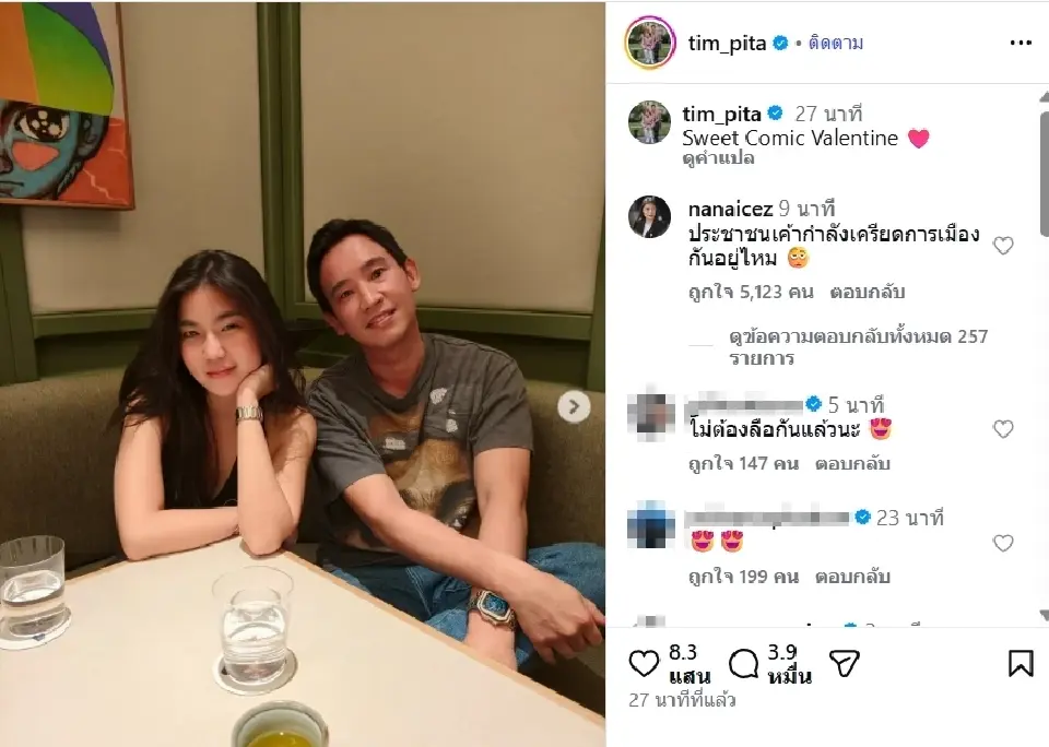 ล่าสุดพิธาได้โพสต์ภาพโมเมนต์หวานลงโซเชียล ทั้งภาพครอบครัวและภาพกับลูกสาว "น้องพิพิม" พร้อมแคปชั่น “Sweet Comic Valentine” และอิโมจิรูปหัวใจ ทำให้แฟนคลับฟินและกรี๊ดในคอมเมนต์