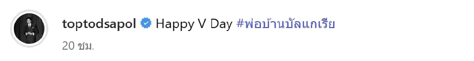 นอกจากนี้ ท็อปยังโพสต์ภาพพร้อมแคปชั่น "Happy V Day #พ่อบ้านบัลแกเรีย" ซึ่งมีชาวเน็ตเข้ามาคอมเมนต์ส่งอีโมจิหัวใจสีแดงจำนวนมาก
