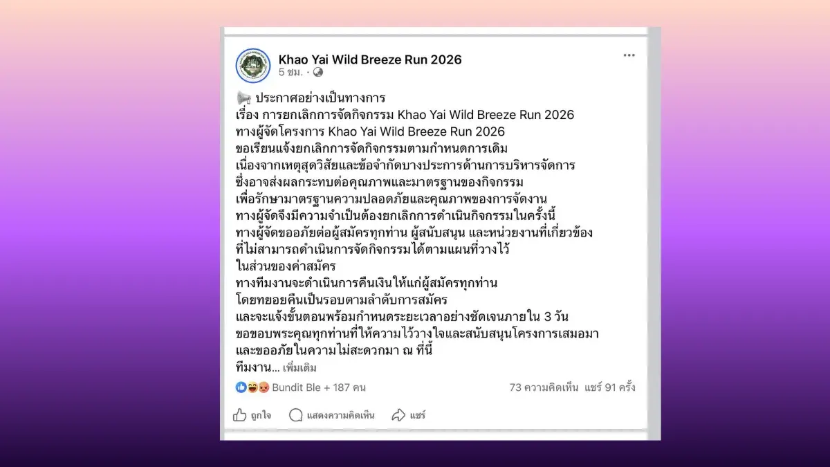 กลายเป็นประเด็นร้อนแรงรับอรุณวันที่ 15 กุมภาพันธ์ เมื่อความตั้งใจดีของนักวิ่งกว่า 1,800 ชีวิต ที่หวังจะมาร่วมออกกำลังกายและทำบุญซื้อเครื่องมือแพทย์ กลับต้องกลายเป็นฝันสลายและเต็มไปด้วยความวุ่นวาย ณ ใจกลางอุทยานแห่งชาติเขาใหญ่ เมื่อผู้จัดงาน "Khao Yai Wild Breeze Run 2026" หายตัวไร้ร่องรอย ทิ้งให้นักวิ่งเผชิญชะตากรรมท่ามกลางความไม่พร้อมของสถานที่และอุปกรณ์