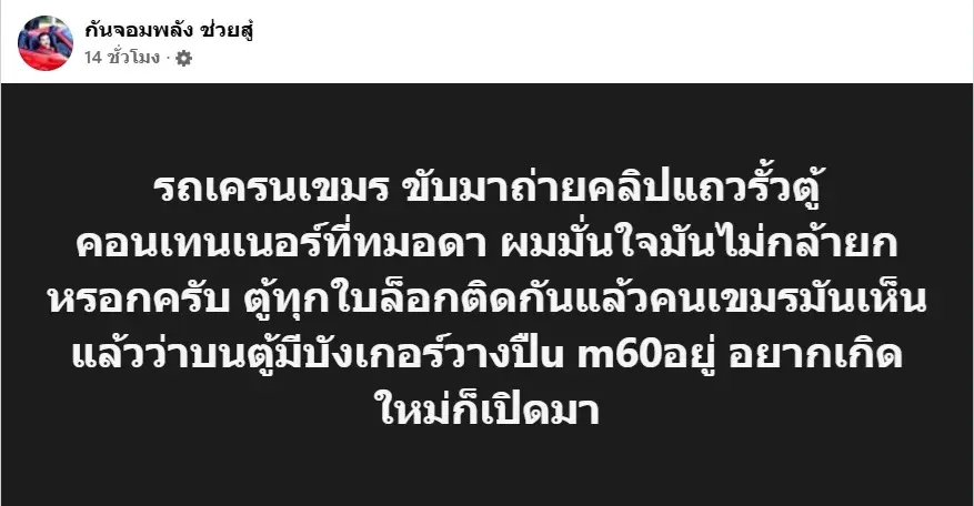 "กัน จอมพลัง" ท้าทหารเขมร หลังขนรถเครนเตรียมรื้อคอนเทนเนอร์ "ทมอดา".. ลั่น! ฝั่ง "ไทย" ตั้งปืนกล M60 รอแล้ว!! เขมรท่าจะเอาจริง สั่งขนรถเครนเตรียมรื้อตู้คอนเทนเนอร์ที่ "ทมอดา" แต่ทว่าฝั่ง "ไทย" ก็เตรียมปืนกล M60 เอาไว้รอแล้ว บุกมาเมื่อไหร่จัดให้อย่างแน่นอน ด้านอินฟลูฯ ดัง "กัน จอมพลัง" ถึงกับท้าถ้าอยากจะไปเกิดใหม่ก็รีบมาไวๆ เลย อย่าดีแต่ขู่ไม่ใช่ลูกผู้ชายพอ