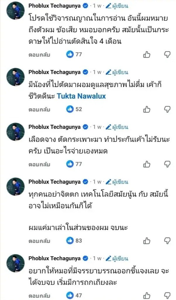 ทั้งนี้ ผู้เสียชีวิตได้เคยทิ้งท้ายไว้ว่า ข้อมูลดังกล่าวเป็นเพียงประสบการณ์ส่วนบุคคล เนื่องจากเทคโนโลยีการแพทย์เมื่อ 15 ปีก่อนกับปัจจุบันมีความแตกต่างกัน แต่อยากให้เรื่องราวของตนเป็นคำเตือนให้ทุกคนพิจารณาให้รอบคอบก่อนตัดสินใจ