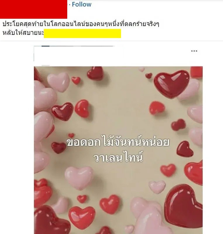 ภาวะความเครียด: เจ้าตัวโพสต์ข้อความเชิงตัดพ้อและขอดอกไม้จันทน์ในวันวาเลนไทน์ที่ผ่านมา ก่อนจะมีข่าวการเสียชีวิตในเวลาต่อมา