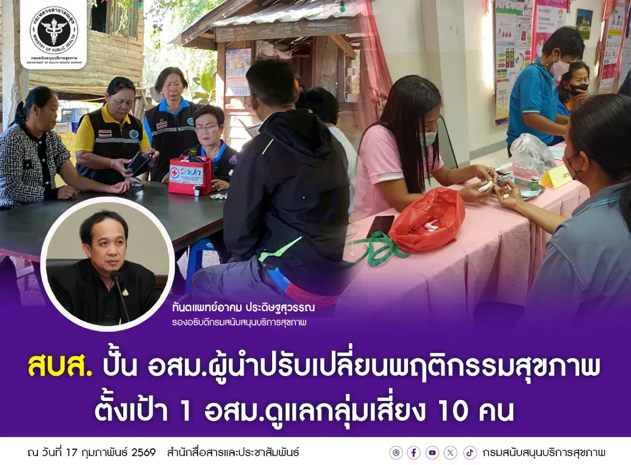 กรมสนับสนุนบริการสุขภาพ (สบส.) กระทรวงสาธารณสุข พัฒนาอาสาสมัครสาธารณสุขประจำหมู่บ้าน (อสม.) สู่ อสม.ผู้นำการปรับเปลี่ยนพฤติกรรมสุขภาพ ตั้งเป้า อสม. 1 คน ดูแลประชาชนกลุ่มเสี่ยงหรือผู้ป่วยโรคไม่ติดต่อเรื้อรัง (NCDs) จำนวน 10 คน เพื่อเป็นกลไกสำคัญในการขับเคลื่อนการป้องกันโรค NCDs ในระดับชุมชน