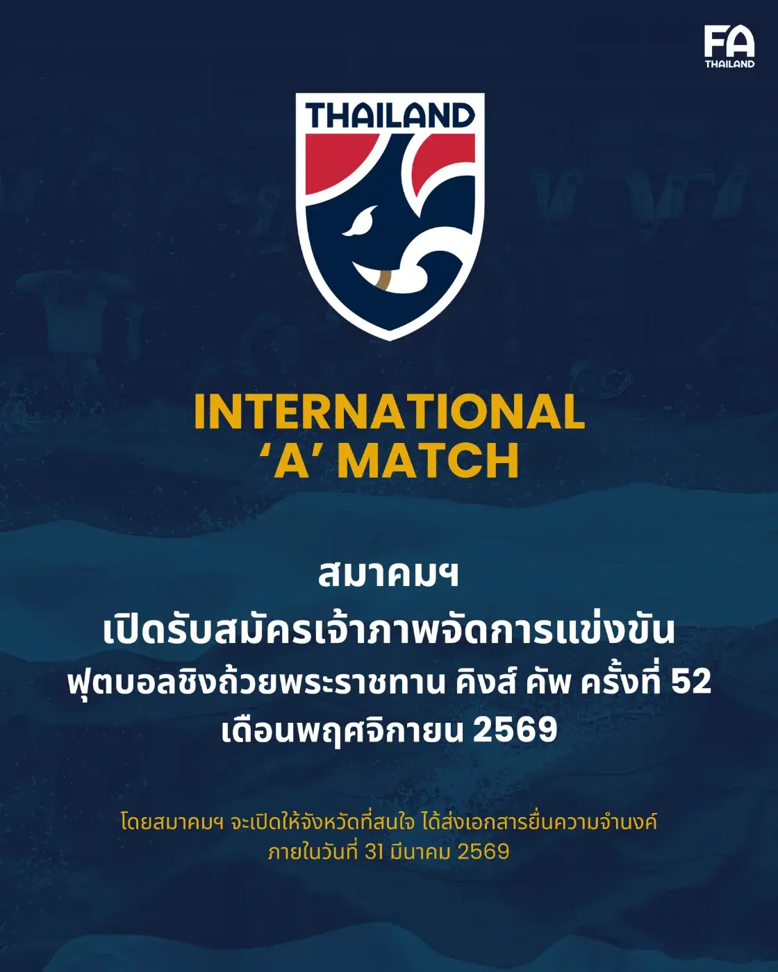 โดยสมาคมจะเปิดให้ จังหวัดที่สนใจ ส่งเอกสารยื่นความจำนงค์ได้ตั้งแต่บัดนี้ จนถึงวันที่ 31 มีนาคม 2569 โดยสามารถส่งหนังสือมายังสมาคมกีฬาฟุตบอลแห่งประเทศไทยฯ หรือ E-mail ได้ที่ info@fathailand.org