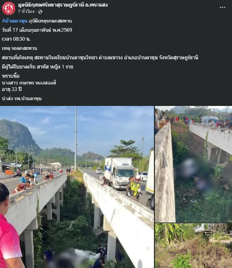 เมื่อเวลา 08.30 น. วันที่ 17 กุมภาพันธ์ 2569 เกิดอุบัติเหตุรถยนต์เก๋งหลุดโค้งตกสะพานบริเวณหน้าโรงเรียนบ้านตาขุนวิทยา จ.สุราษฎร์ธานี เจ้าหน้าที่พบผู้บาดเจ็บ 1 ราย ชื่อ น.ส.กนกพร ทองสองสี อายุ 33 ปี ในอาการสาหัส เจ้าหน้าที่กู้ภัยเร่งช่วยเหลือและนำส่งโรงพยาบาลบ้านตาขุน แต่สุดท้าย น.ส.กนกพรไม่สามารถทนพิษบาดแผลได้และเสียชีวิตในเวลาต่อมา ทำให้ญาติและผู้ที่ทราบข่าวรู้สึกเสียใจอย่างมาก